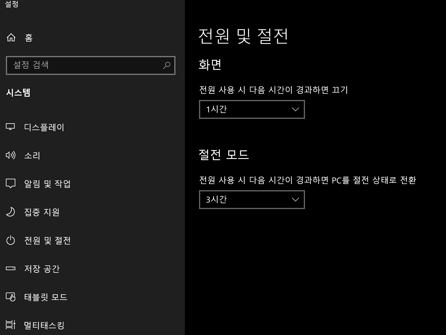 아래 이미지처럼 절전모드를 발동하는 시간을 지연시키거나 또는 "안함"을 선택해서 절전모드 자체를 사용하지 않는 방법이 현재로서는 최선이다. 게임을 돌리지 않는 한 일반 사무직 PC에서 1시간 전력사용량이 뭐 얼마나 되겠는가.