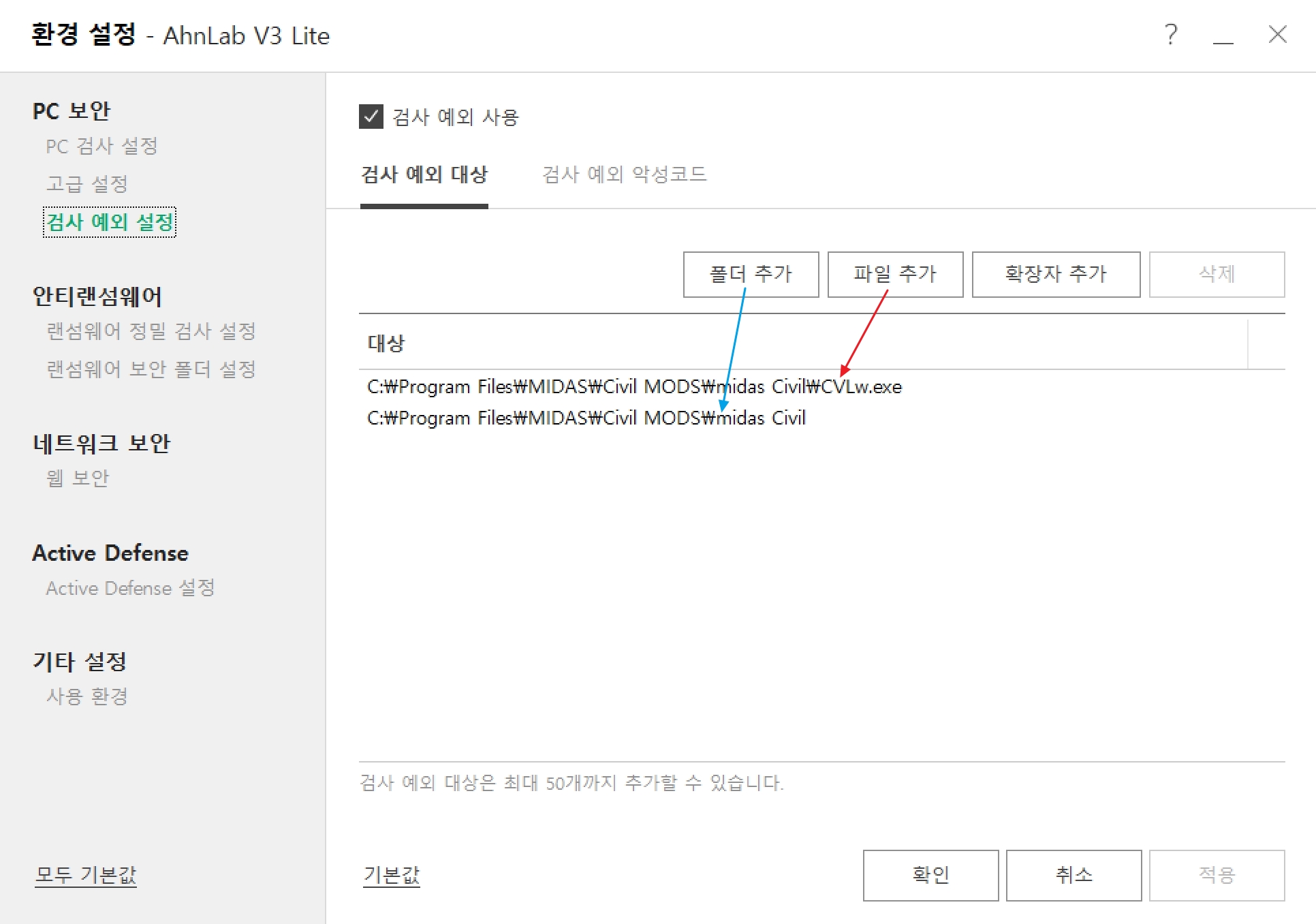 (V3의 경우) V3 프로그램의 환경설정으로 들어가서 검사예외 설정으로 가면 파일추가와 폴더추가가 있는데 각각 마이다스 프로그램(나는 Civil을 사용)과 마이다스 실행파일이 들어있는 폴더를 추가해 주었다.