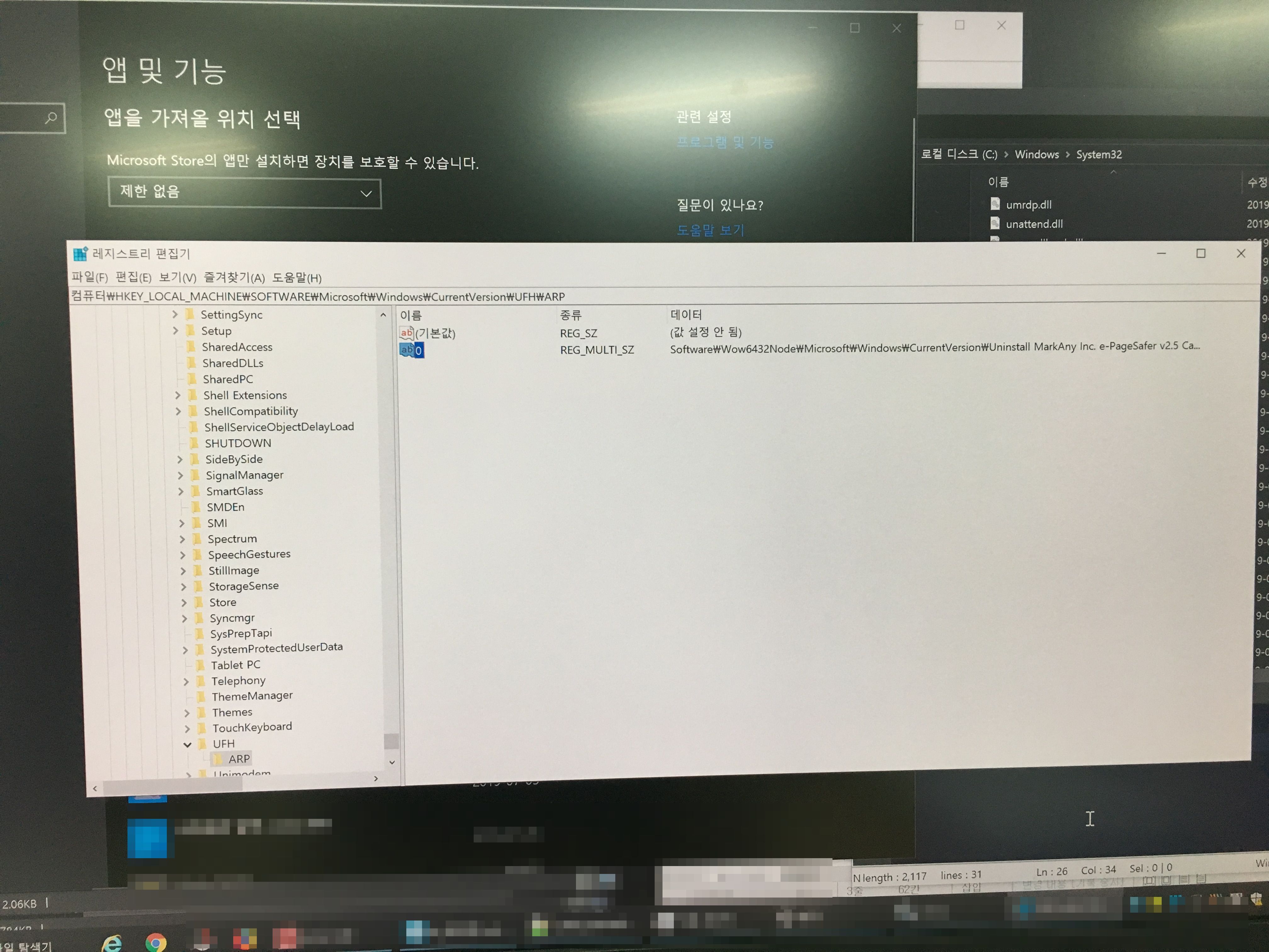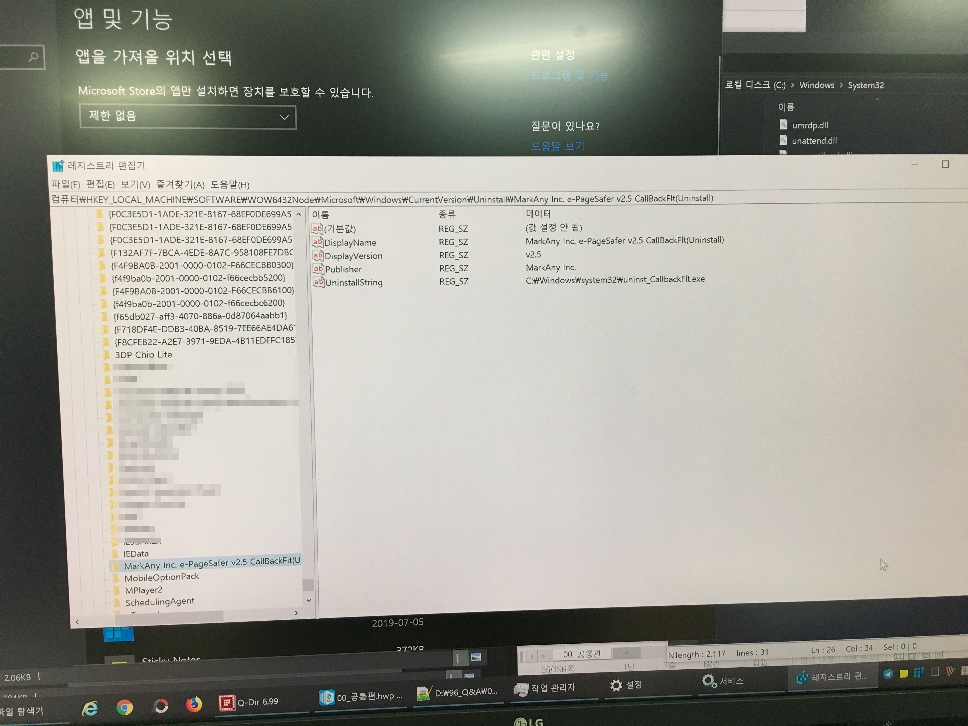 아니나 다를까, 이번 'e-나라 표준인증' 웹사이트에서 반강제로 설치당한(?) 프로그램도 결국 언인스톨이 제대로 되지 않았다. 하나만 설치되는 줄 알았는데 두 개가 설치되어 있었고, 메인 프로그램을 삭제한 후 남아있는 프로그램을 삭제하려고 하자, system32안에 있는 언인스톨러.....exe 실행파일이 없다면서 삭제가 진행되지 않았다. 실제로 파일은 없는데 레지스트리에서 남아있는 경우다. 뭐 이런 경우는 제어판에서 삭제하면 목록에서 없앨 수는 있다.