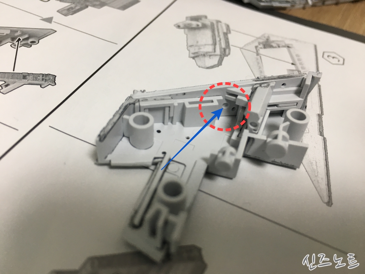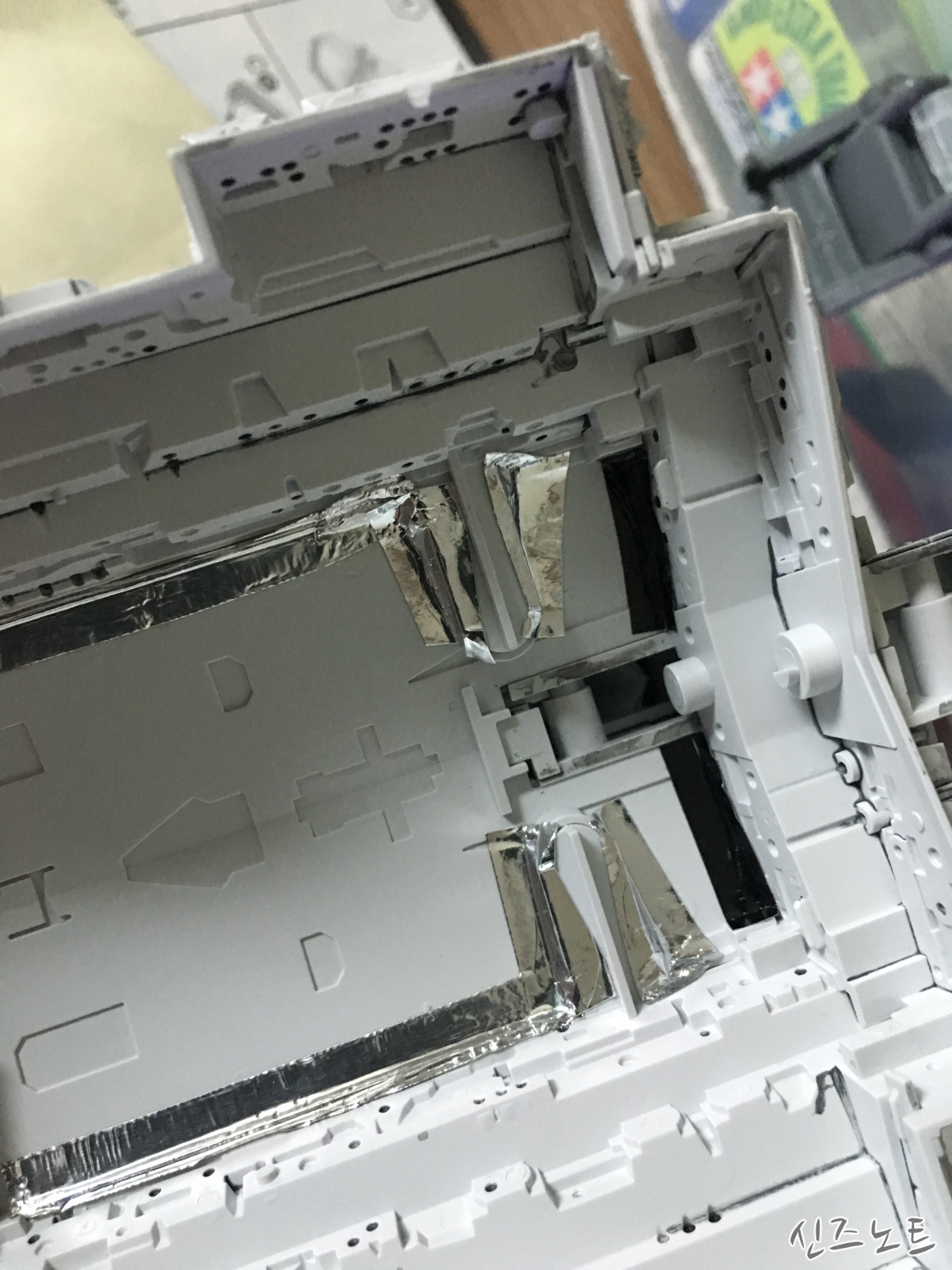 LED가 들어가는 킷은 항상 빛샘에 주의해야 하는데, 기본적으로 이 킷은 내부에 빛의 방(?)을 만들어서 고루 빛을 분사하는 방식이다. 그래서 부품의 접합부 마다 약간의 틈이라도 있다면 빛은 그 틈으로 새어나올 수 밖에 없다. 다행히 반다이 킷이기 때문에 런너자국을 오히려 과도하게 말끔히 정리한다는 생각으로 커팅을 제대로 해주면 새어 나오는 빛의 양은 기본적으로 많지 않을 것이다. 하지만 조립설명서에 언급하지 않은 부분 중에 알루미늄 테이프로 막아줘야 할 부분이 꽤 있다. 예를 들면 아래의 사진들을 참고..
