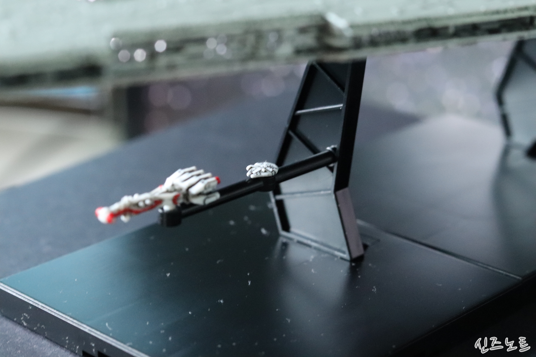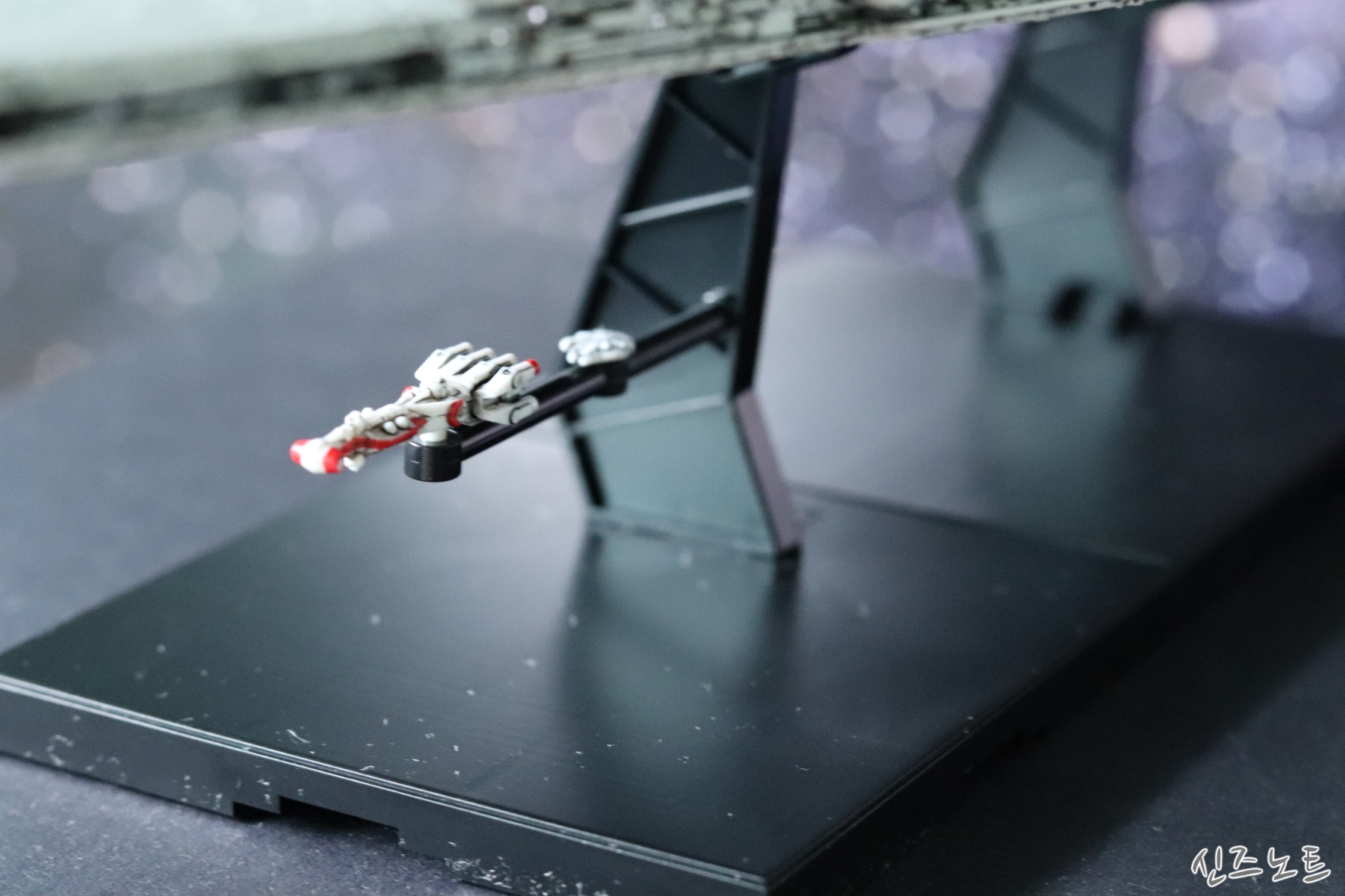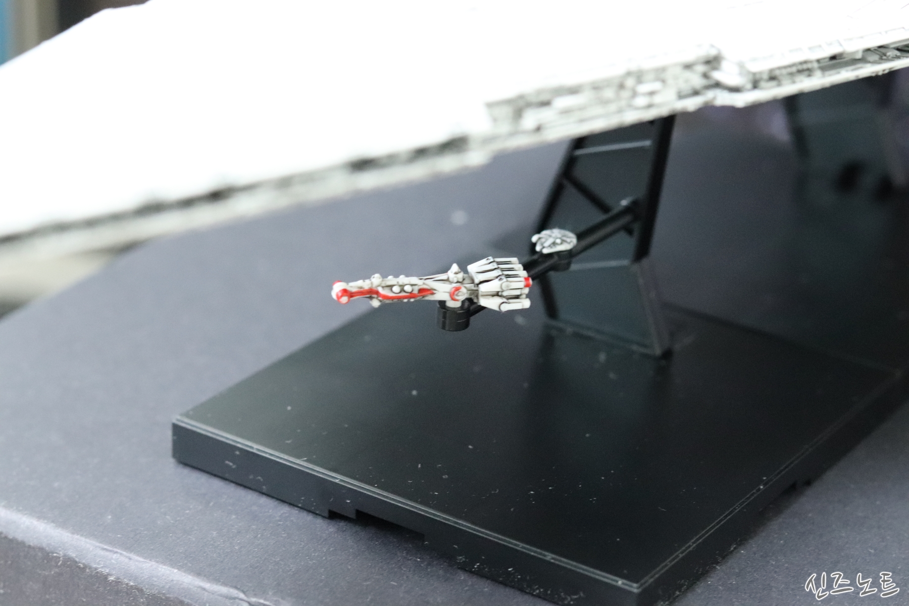 다섯 번째 단점은 받침대다. 이건 이 킷 전용으로 만든 건지 아니면 다른 킷에도 쓰는 건지 잘 모르겠지만, 런너 형태로 볼 때 다른 킷에도 쓰는 부품같았다. 스타 디스트로이어는 큰데 받침대 한 부품이 작으니까 그 거 두개를 작은 연결부품으로 연결시킨 형태로 받침대를 구현하고 있다. 이건 심지어 받침대를 손으로 들어올리기라도 했다간 받침대부터 무너진다. 아아....;; 받침대를 왜 이따구로 해놨는지 참....