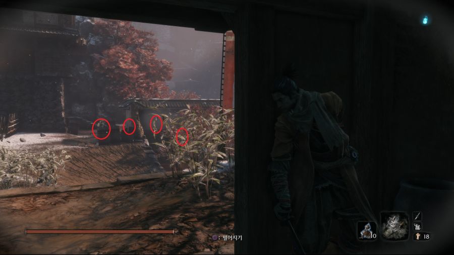 우측 담벼락 옆 적 처치 후 도자기 파편 획득. 이후 중간 적 우측 풀숲으로 떨어진 뒤 벽에 매달려서 벽인살 후 올라가 왼쪽 적 뒤편으로 가서 인살. 환약과 재덩어리 획득.