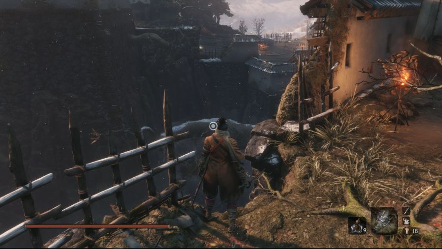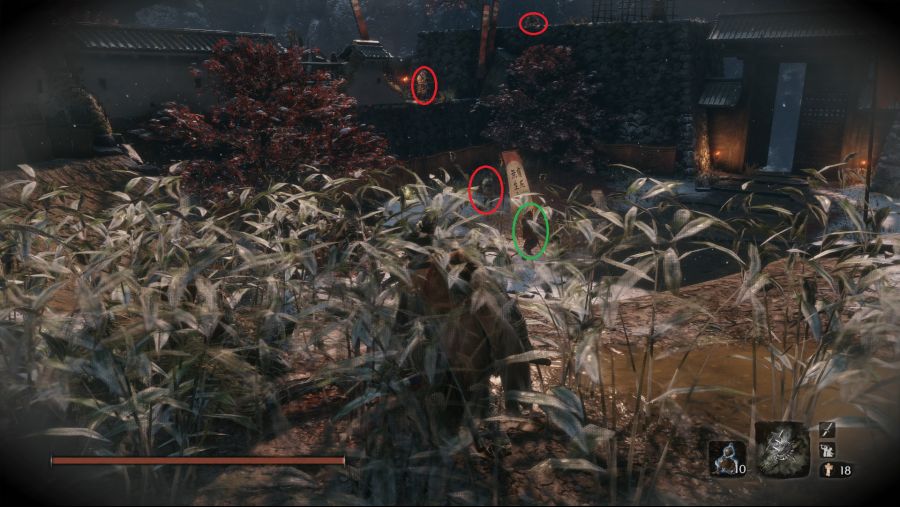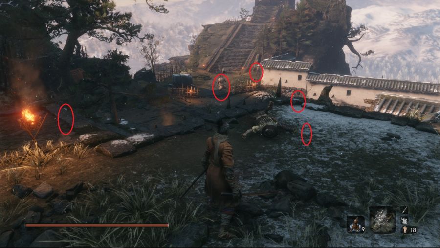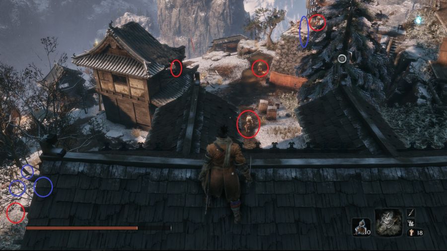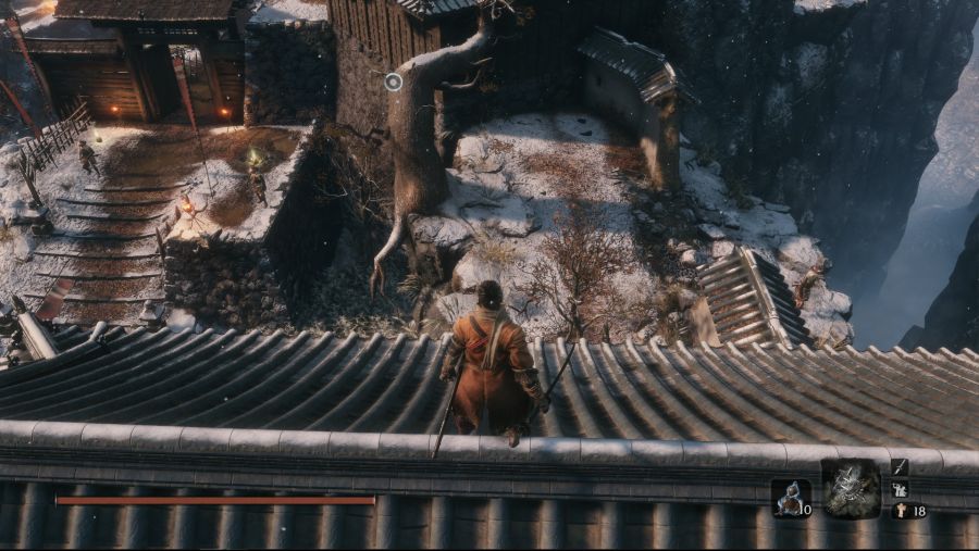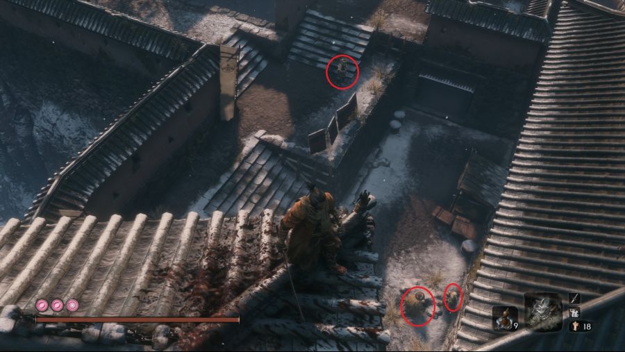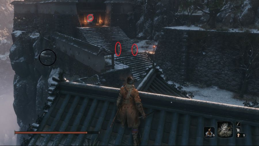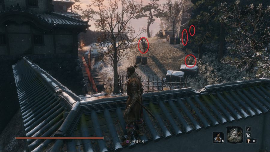 건물 밖으로 나와 떨어지지말고 왼쪽으로 붙어서 벽을 올라가면 환약. 아래쪽을 보면 갑옷을 입은 사무라이가 있는데 미니보스입니다. 뒤편으로 돌아가 인살 스타트 가능.