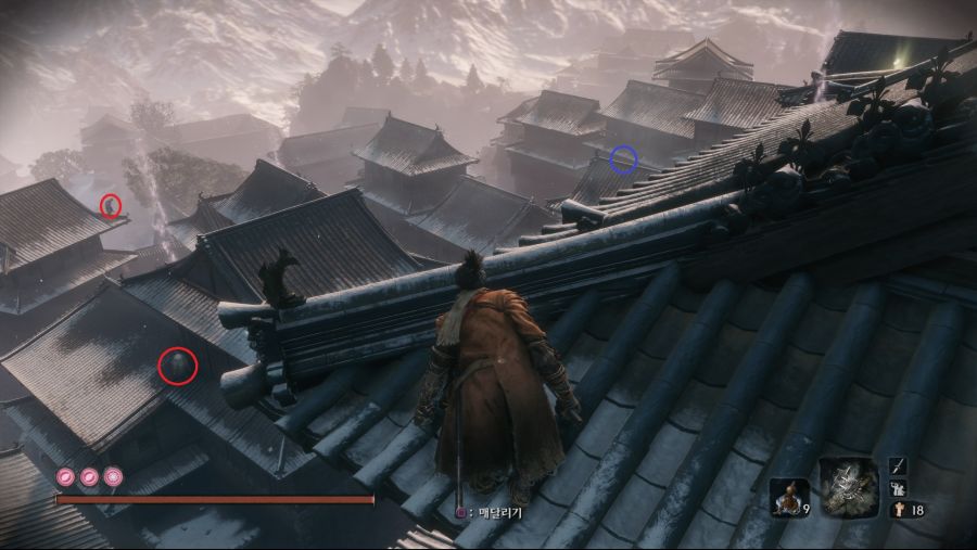 건물 밖으로 나와 떨어지지말고 왼쪽으로 붙어서 벽을 올라가면 환약. 아래쪽을 보면 갑옷을 입은 사무라이가 있는데 미니보스입니다. 뒤편으로 돌아가 인살 스타트 가능.