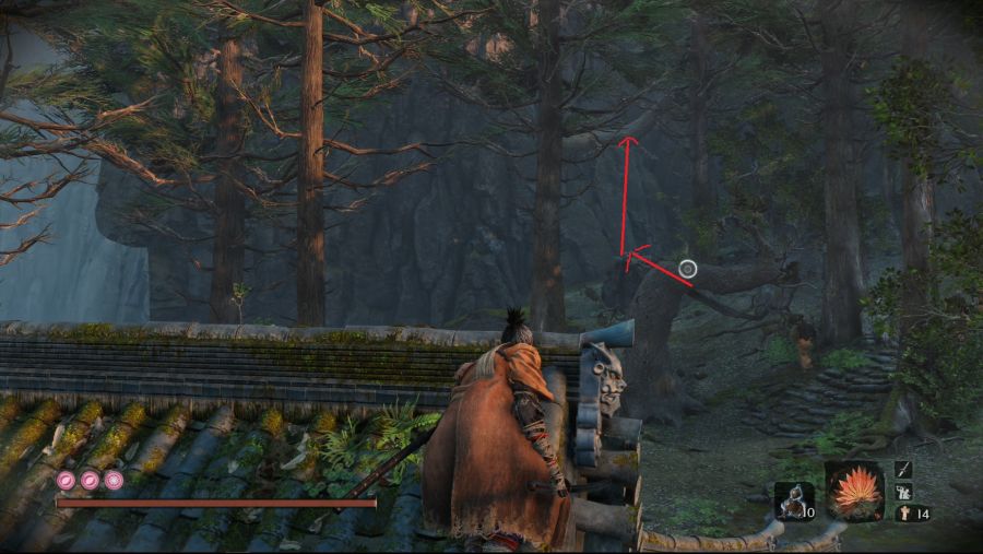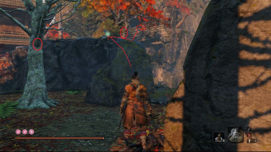 나무 왼쪽 위로 돌턱이 하나 있는데 거기서 정면으로 벽점프하면 위로 올라갈 수 있습니다. 이후 스님들 뒤로 이동 후 인살 시작.