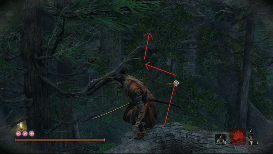 우선 스샷에 보이는 갈고리 포인트로 간 뒤 오른쪽 아래녀석 점프인살. 다시 갈고리로 나무 위로 올라와 점프 매달리기 하면 발판에 매달릴 수 있습니다.