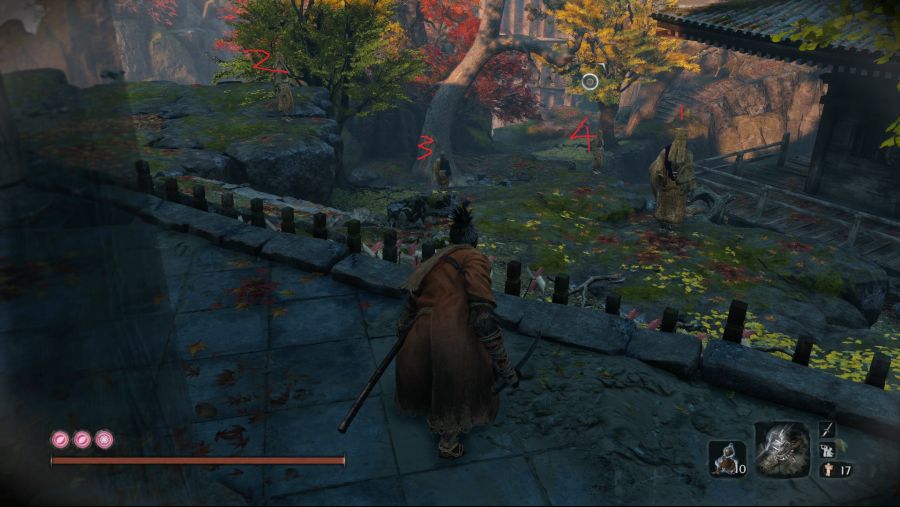 좌측 끝 나무앞에 스님이 한마리 보입니다만 건물 모서리 너머로도 한마리가 대기중이니 도자기 파편으로 벽인살 후 나무 앞 스님까지 인살.