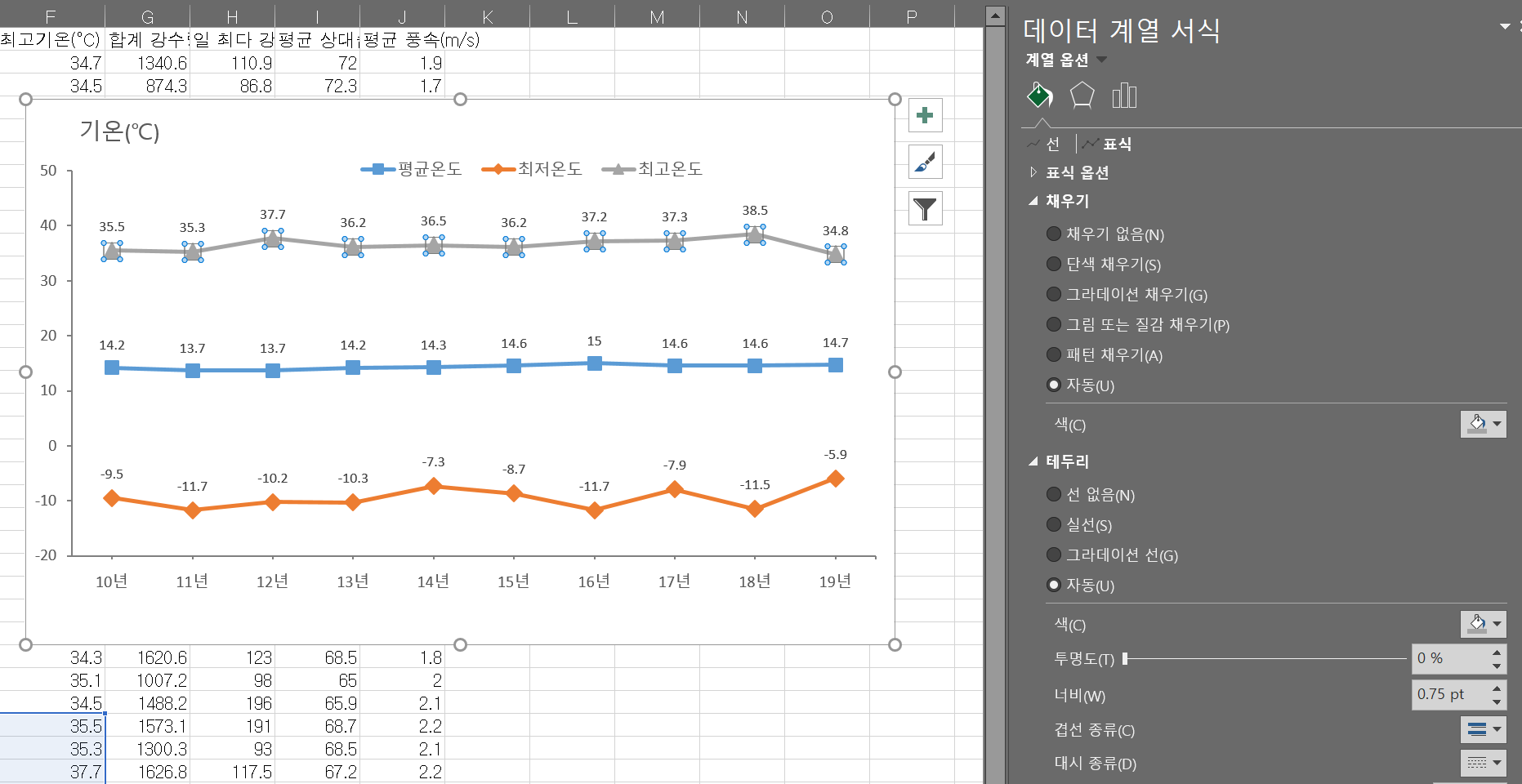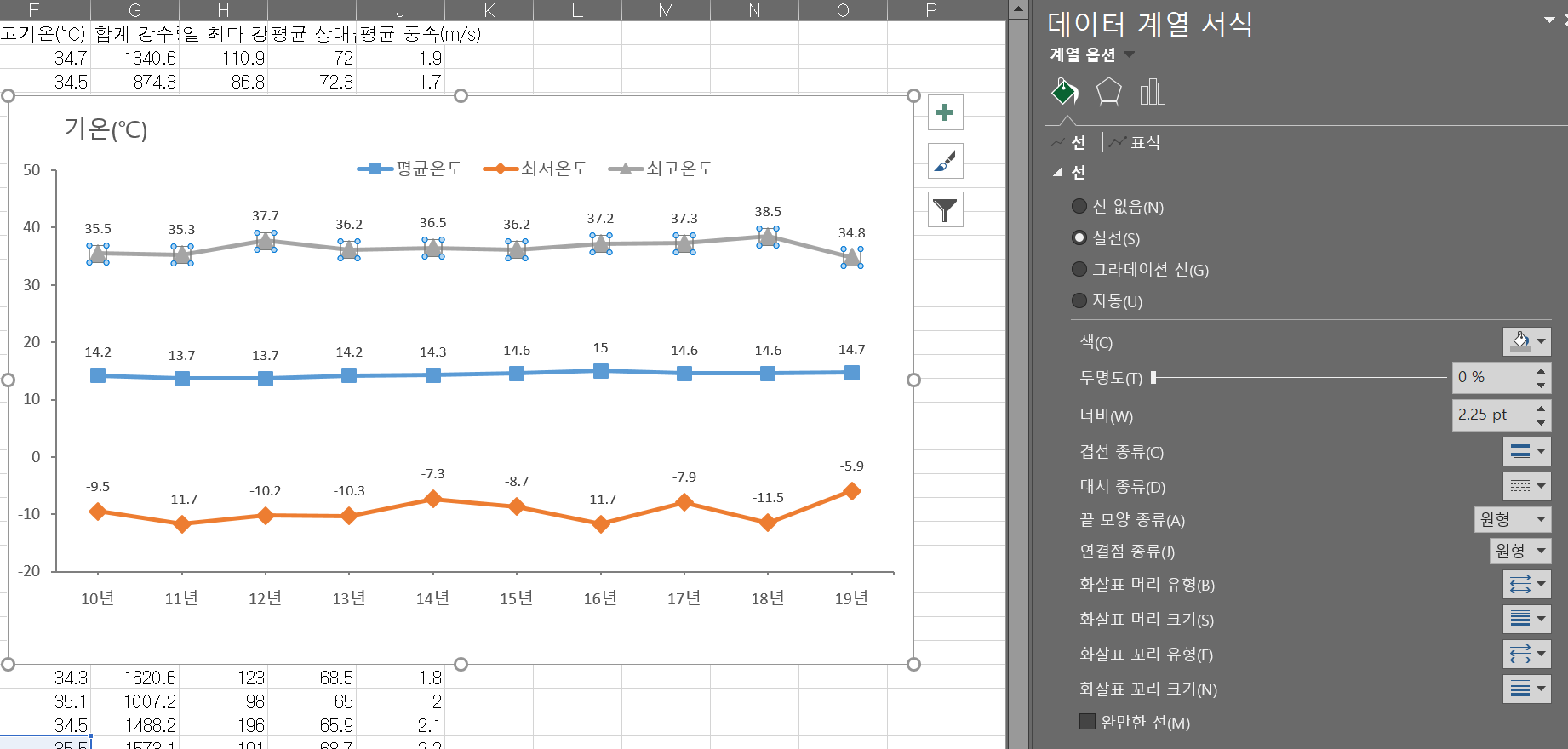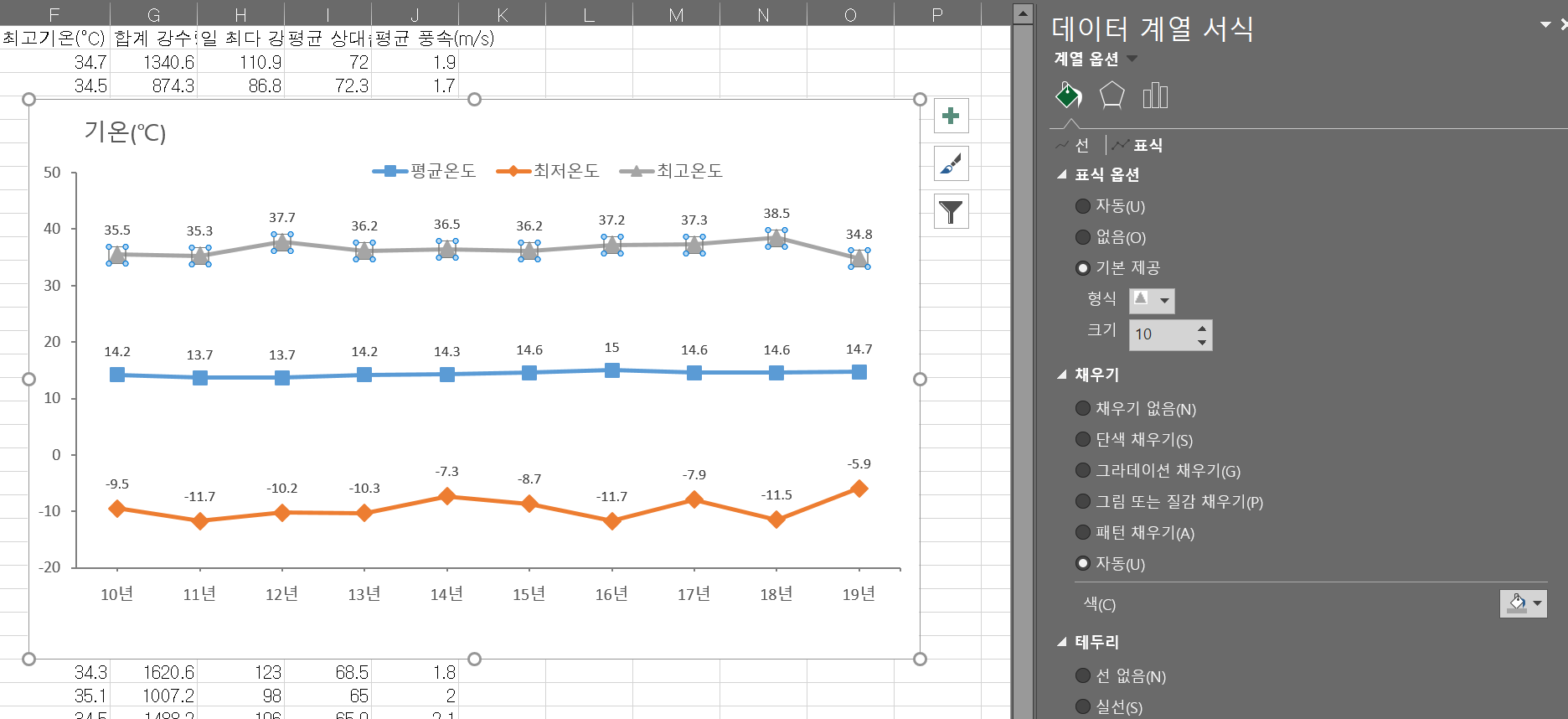 그럼 그제서야 해당 그래프 선 중간 중간에 네모세모마름모땡그라미 등등을 넣을 수 있는 옵션이 보인다.