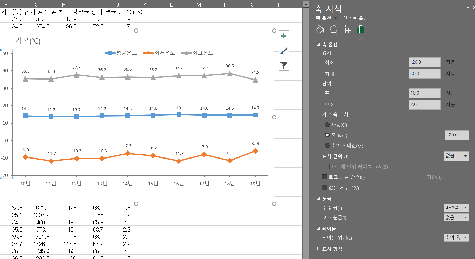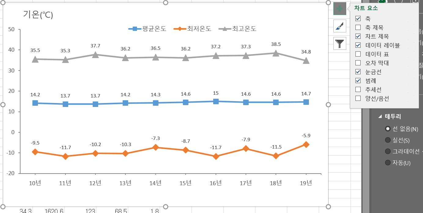 가로축이 세로축의 중간 쯤에 붙어서 생성되는 경우가 자주 있었다. 그 때는 가로축의 위치를 변경해 줄 필요가 있는데, 이는 예전 엑셀과 마찬가지로 세로축을 선택한 상태에서 축 서실에서 '가로 축 교차' 위치를 바꿔주면 된다.