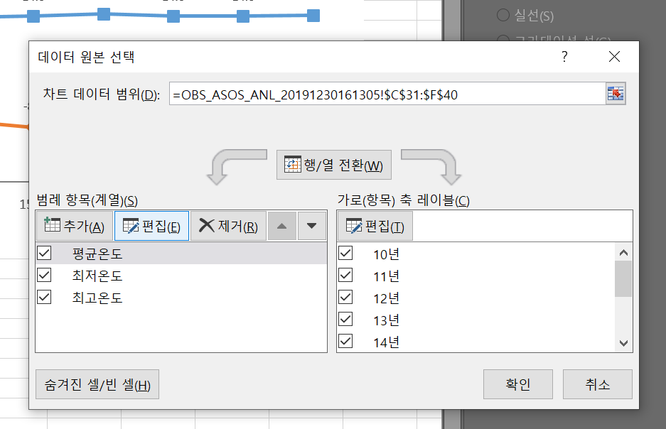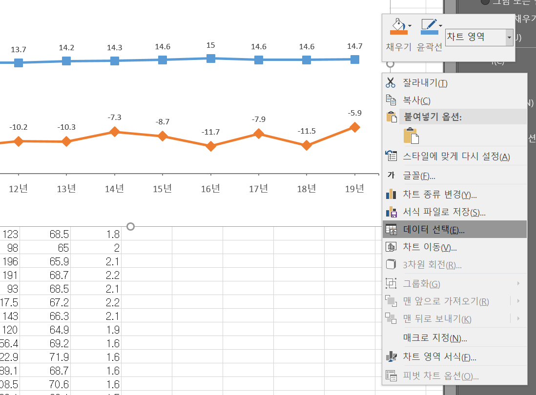 그래프를 우측 클릭해서 '데이터 선택'으로 들어간다. 거기에 보면 아래의 왼쪽 칸에 '범례 항목'이라고 나오고 편집 버튼이 보일 것이다. 그 편집 버튼을 누르고 들어가면 범례 이름을 수정할 수 있다.