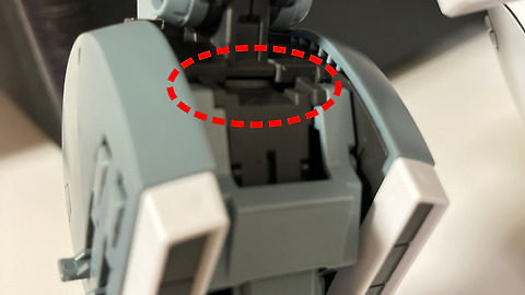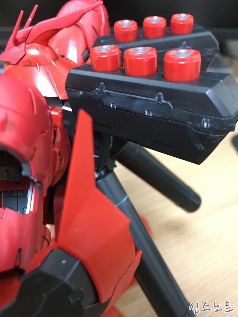 어떻게 보면 가장 심각한 단점인데, 다른 킷과 달리 RG 사자비의 검은색으로 사출된 파츠들에 먹선을 먹이면 잘 닦이지 않고 오히려 원래의 광이 사라지면서 이상하게 번지게 된다. 다른 킷에서는 잘 못보던 증상인데 RG 사자비 킷에서는 유난히 이런 단점이 있었다. 사자비의 쉴드의 검은 부분에 패널라인이 있길래 타미야 XF계 그레이 에너멜로 먹선을 넣어줬더니 아래와 같이 되어 버렸다.