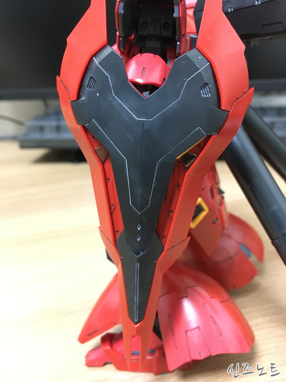 RG 사자비의 흉갑 부분은 조립시 큰 응력을 받고 있는 부분 중 하나이기 때문에 먹선은 조립 전에 넣어주는 것이 좋다. 조립한 후에 먹선을 넣으면 아래 사진과 같이 되어 버린다.