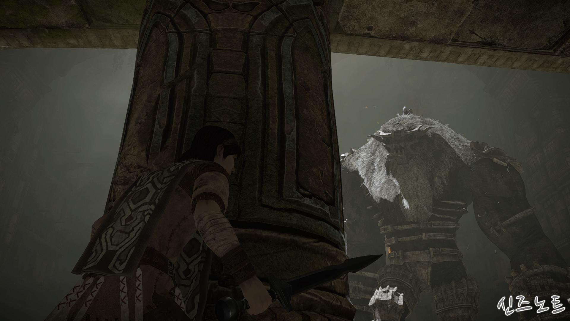 발판이 될만해 보이는 벽들을 모조리 부수면서 돌격해 오는데, 이 때부터 거상의 움직임이 빨라지기에 압박감이 밀려온다. 그대로는 맞설 수 없으니 입구의 반대편으로 가면 숨을 수 있는 공간이 있는데 일단 이 곳으로 숨자. 그러면 고개를 숙여서 안쪽을 보려고 하는데 이 때 수염에 매달려서 올라가면 된다. 네번째 거상과 비슷하다고 할 수 있겠다.