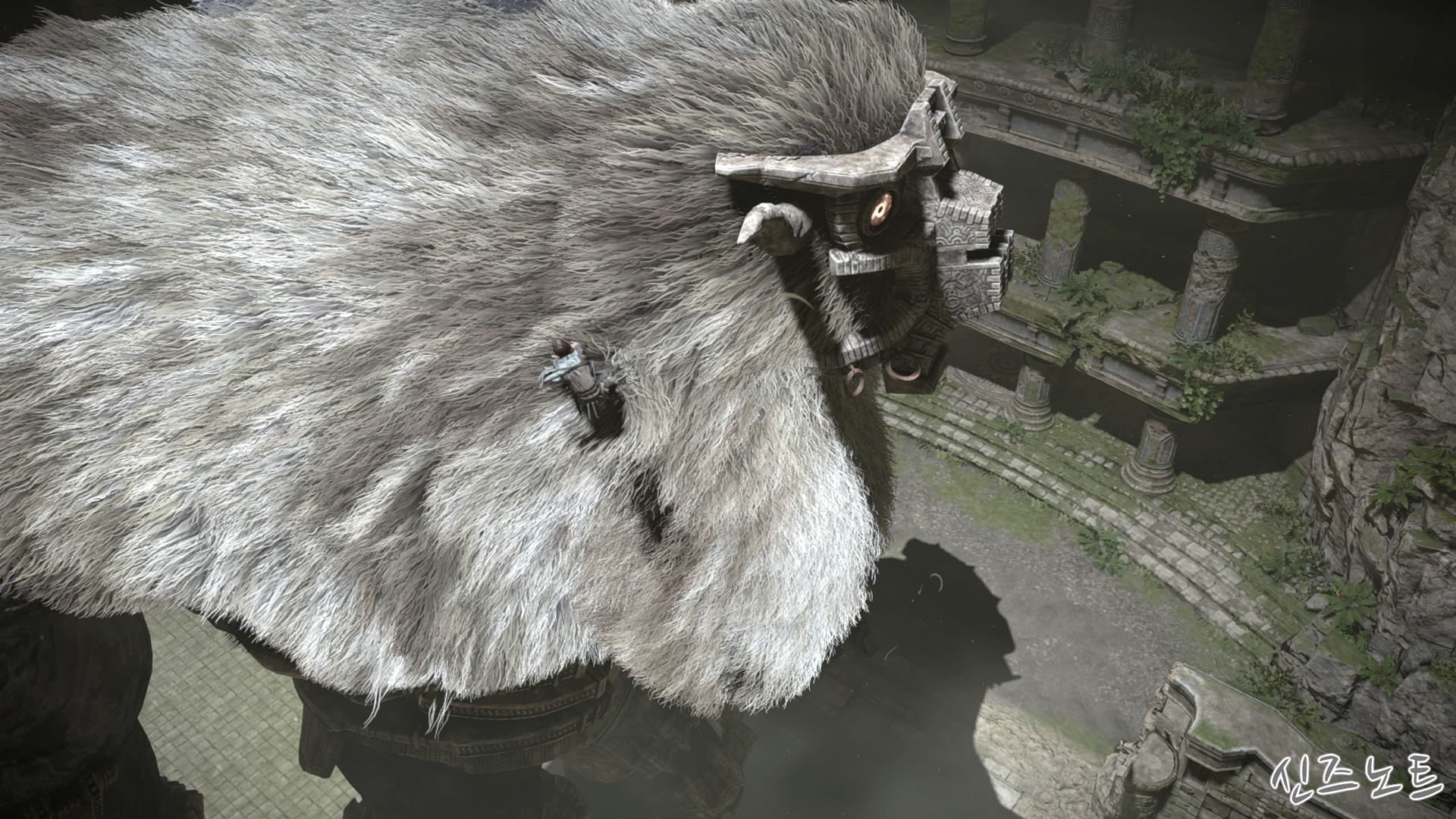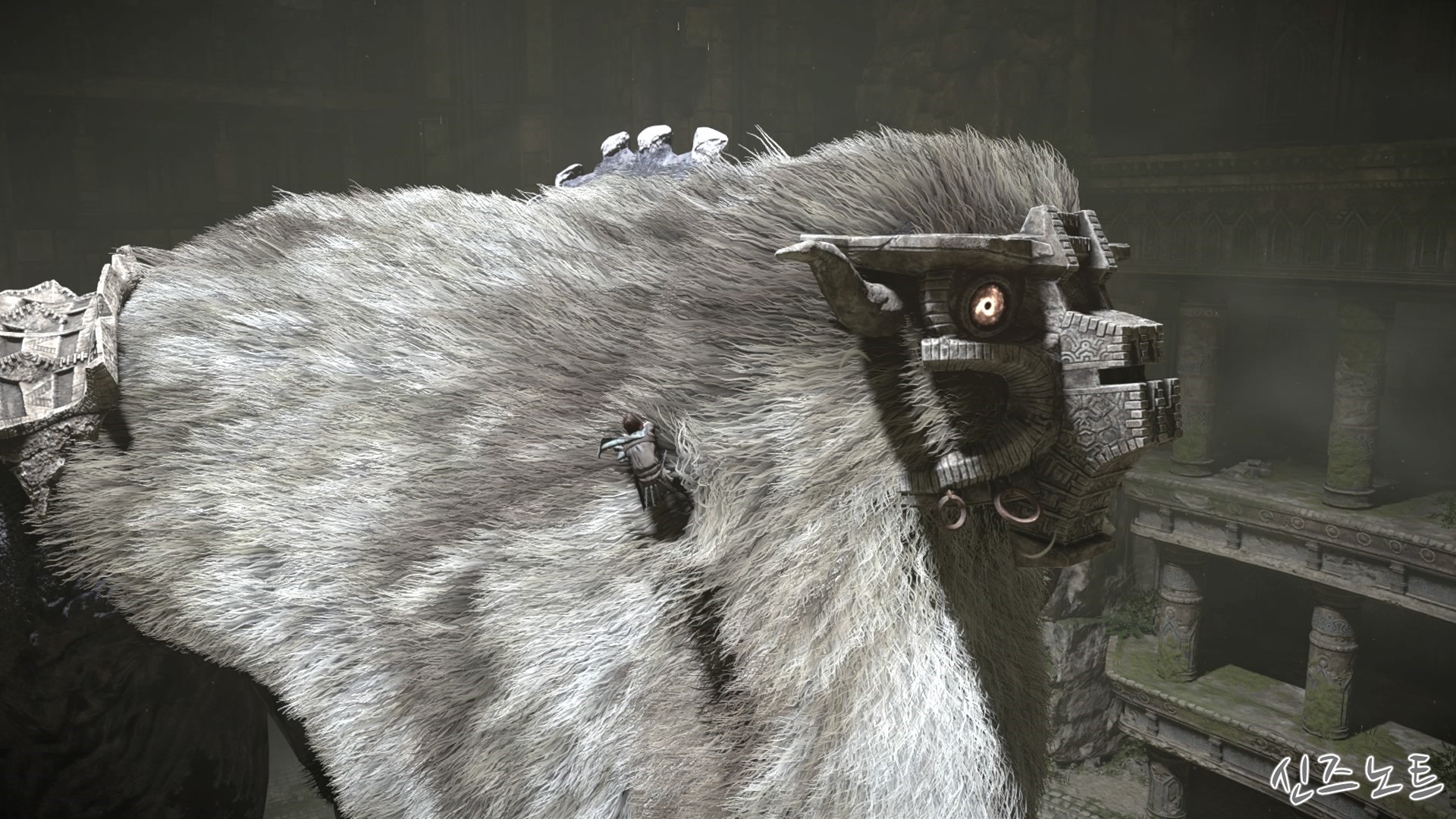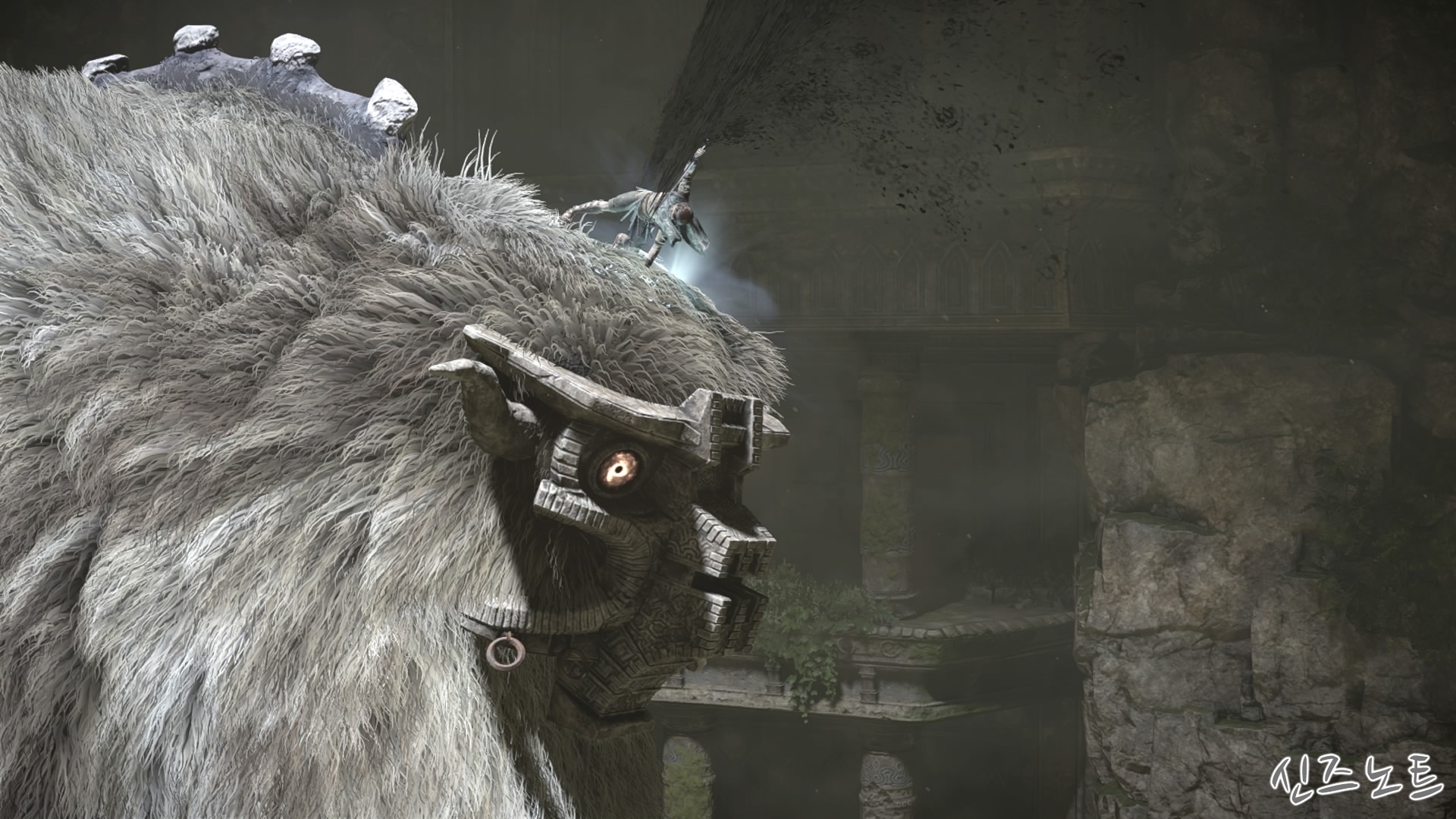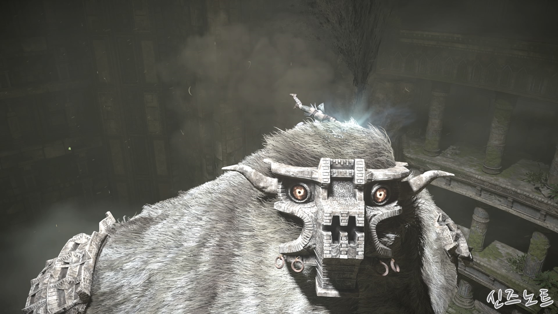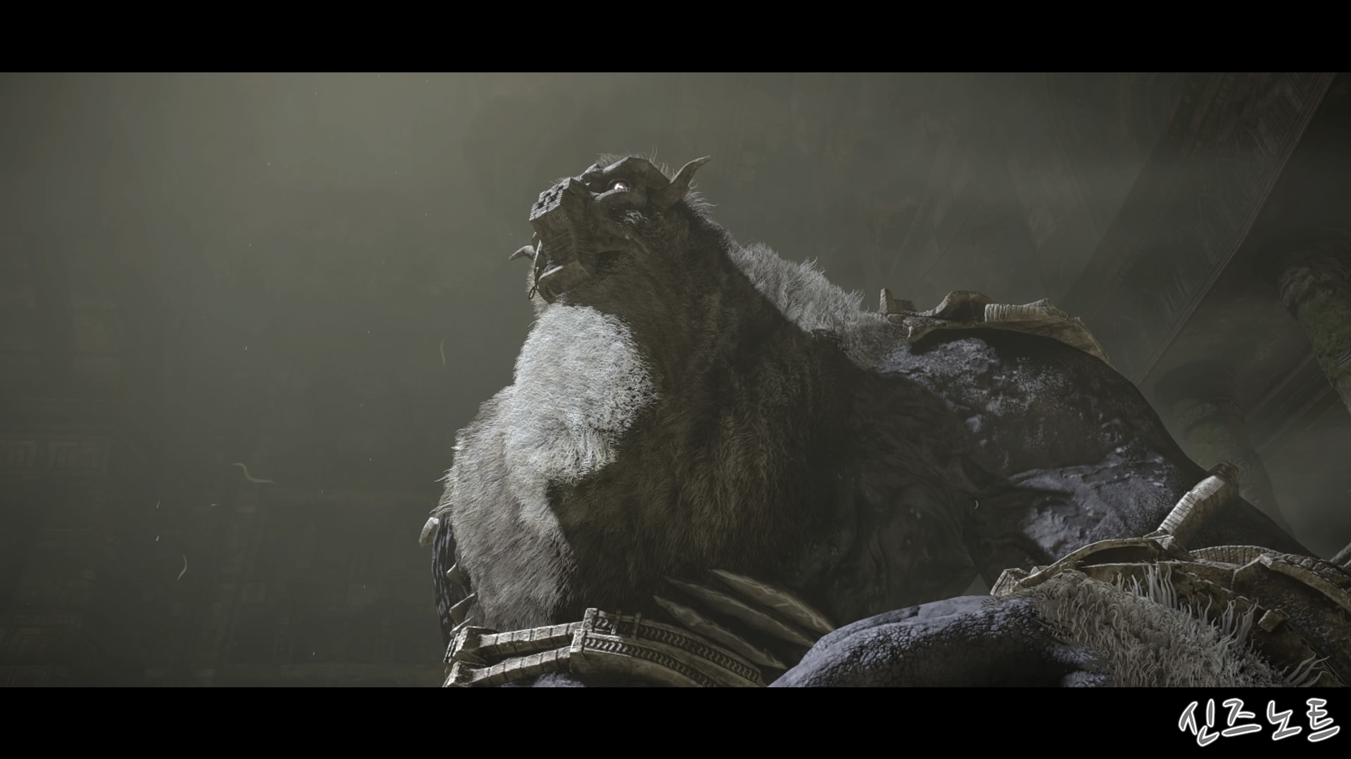 발판이 될만해 보이는 벽들을 모조리 부수면서 돌격해 오는데, 이 때부터 거상의 움직임이 빨라지기에 압박감이 밀려온다. 그대로는 맞설 수 없으니 입구의 반대편으로 가면 숨을 수 있는 공간이 있는데 일단 이 곳으로 숨자. 그러면 고개를 숙여서 안쪽을 보려고 하는데 이 때 수염에 매달려서 올라가면 된다. 네번째 거상과 비슷하다고 할 수 있겠다.