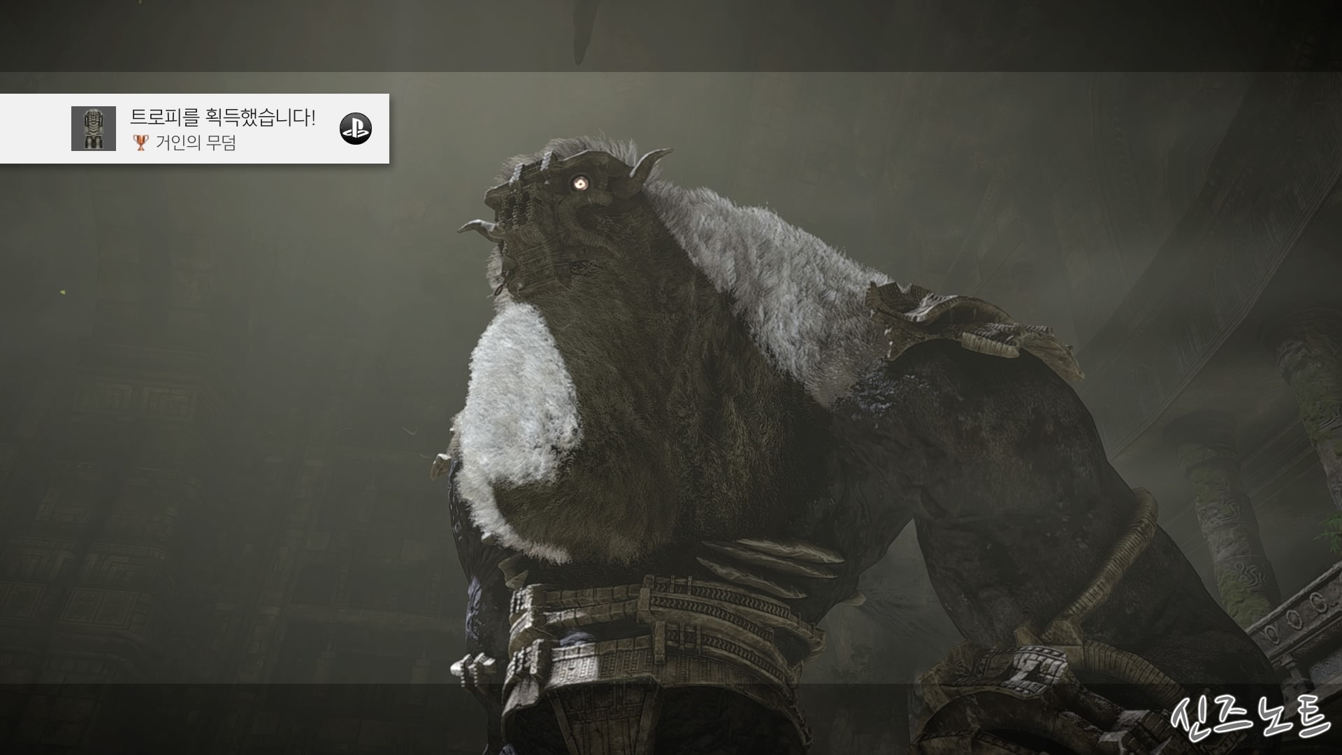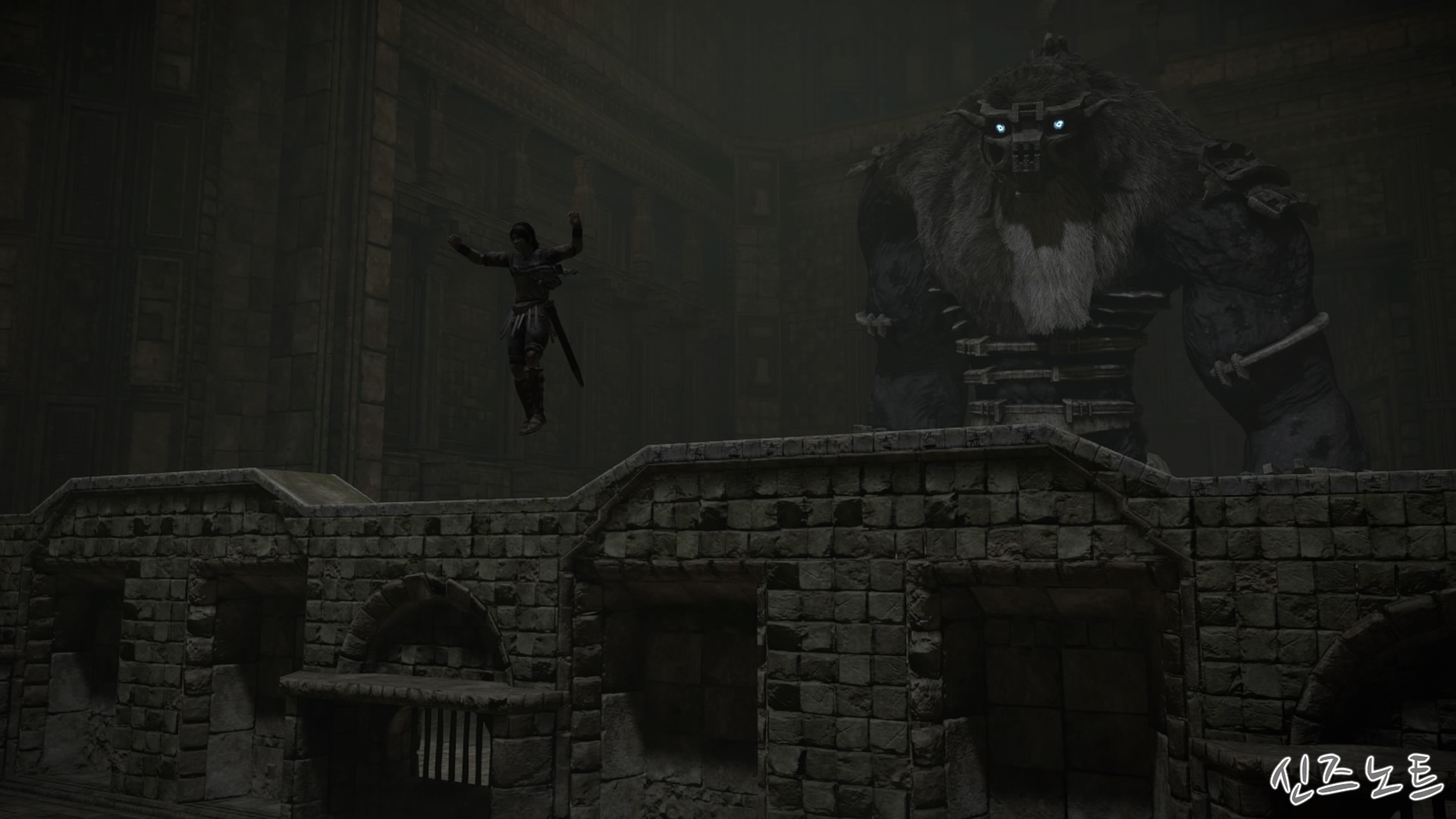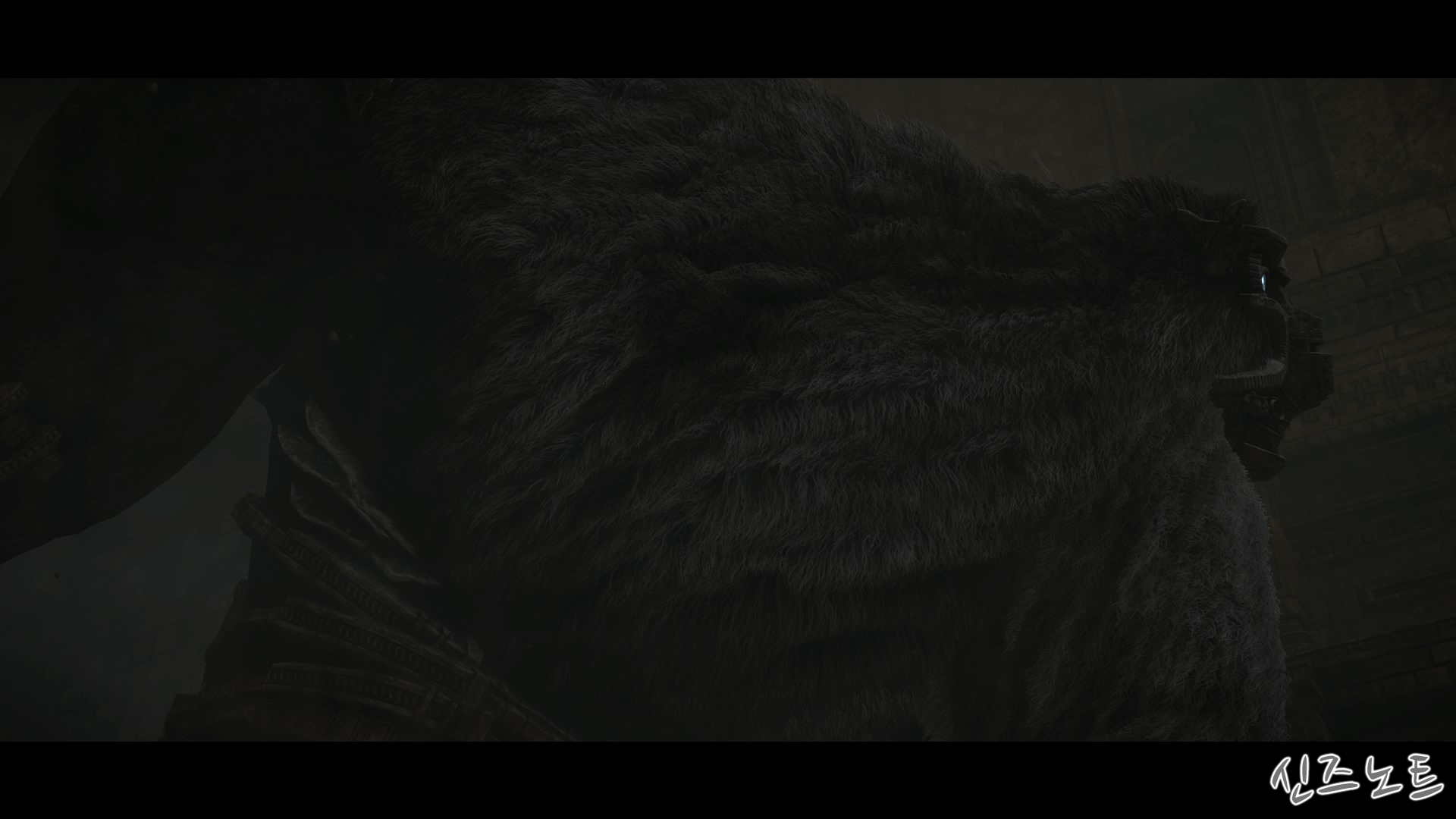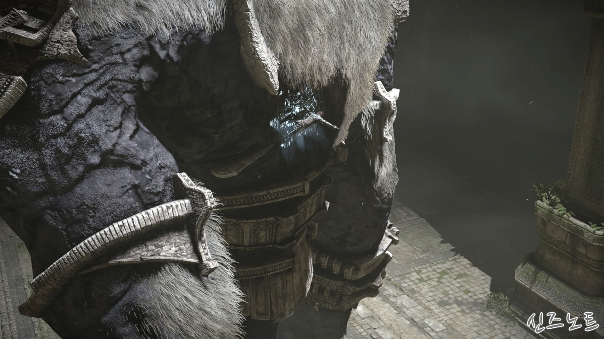발판이 될만해 보이는 벽들을 모조리 부수면서 돌격해 오는데, 이 때부터 거상의 움직임이 빨라지기에 압박감이 밀려온다. 그대로는 맞설 수 없으니 입구의 반대편으로 가면 숨을 수 있는 공간이 있는데 일단 이 곳으로 숨자. 그러면 고개를 숙여서 안쪽을 보려고 하는데 이 때 수염에 매달려서 올라가면 된다. 네번째 거상과 비슷하다고 할 수 있겠다.