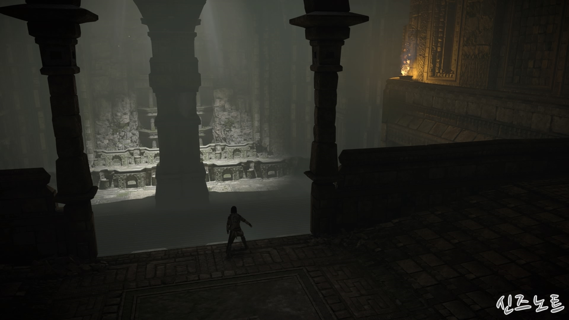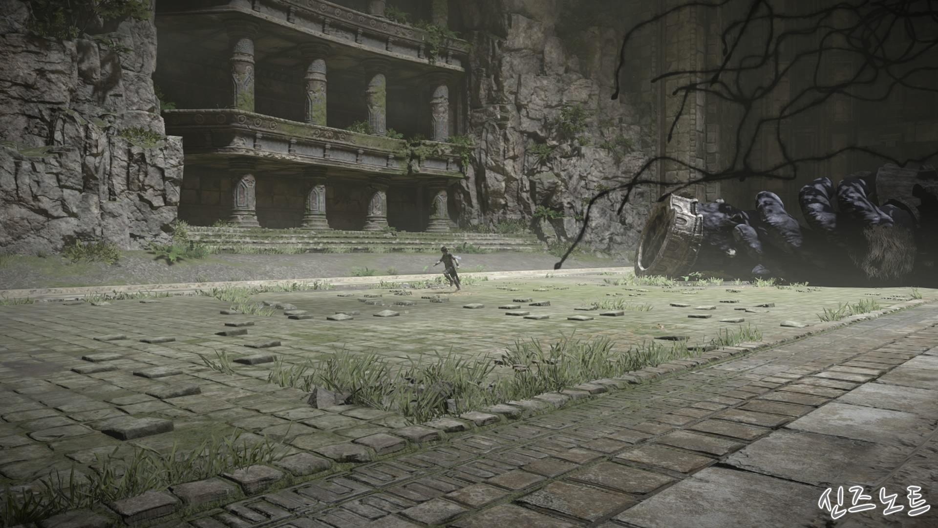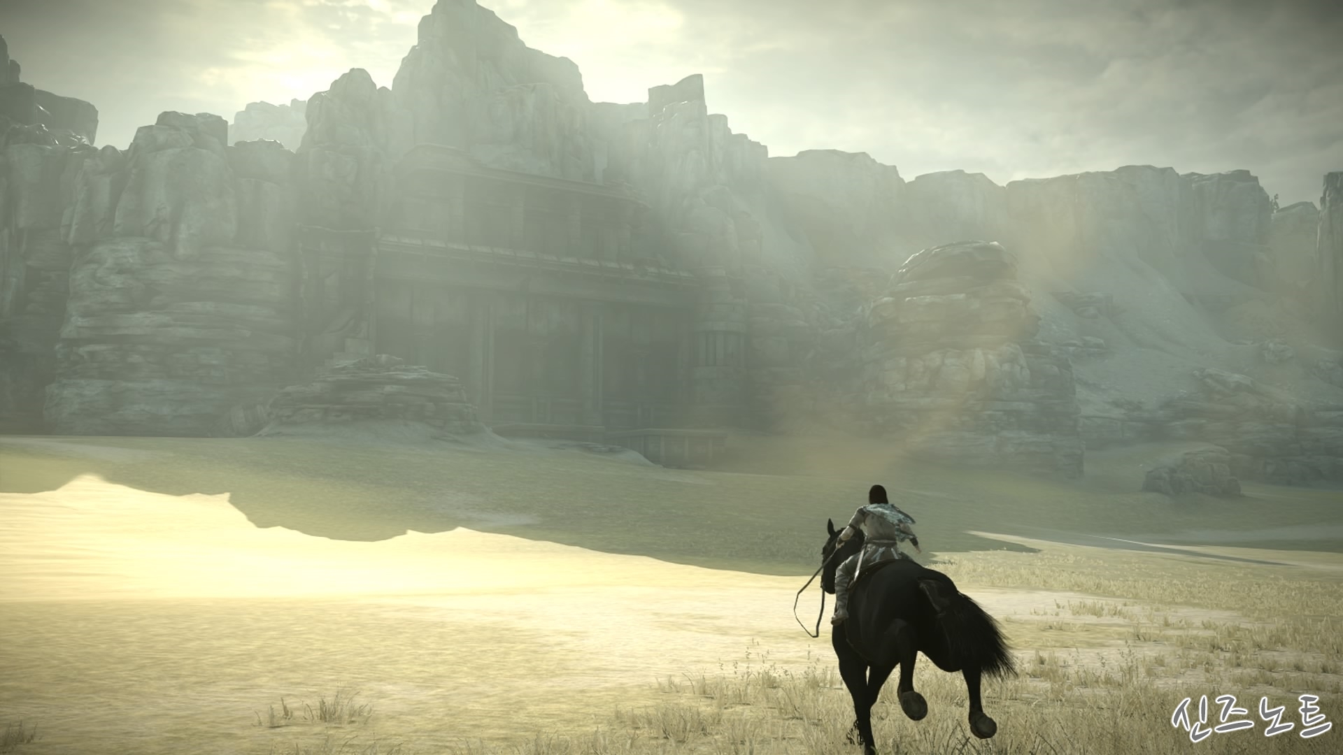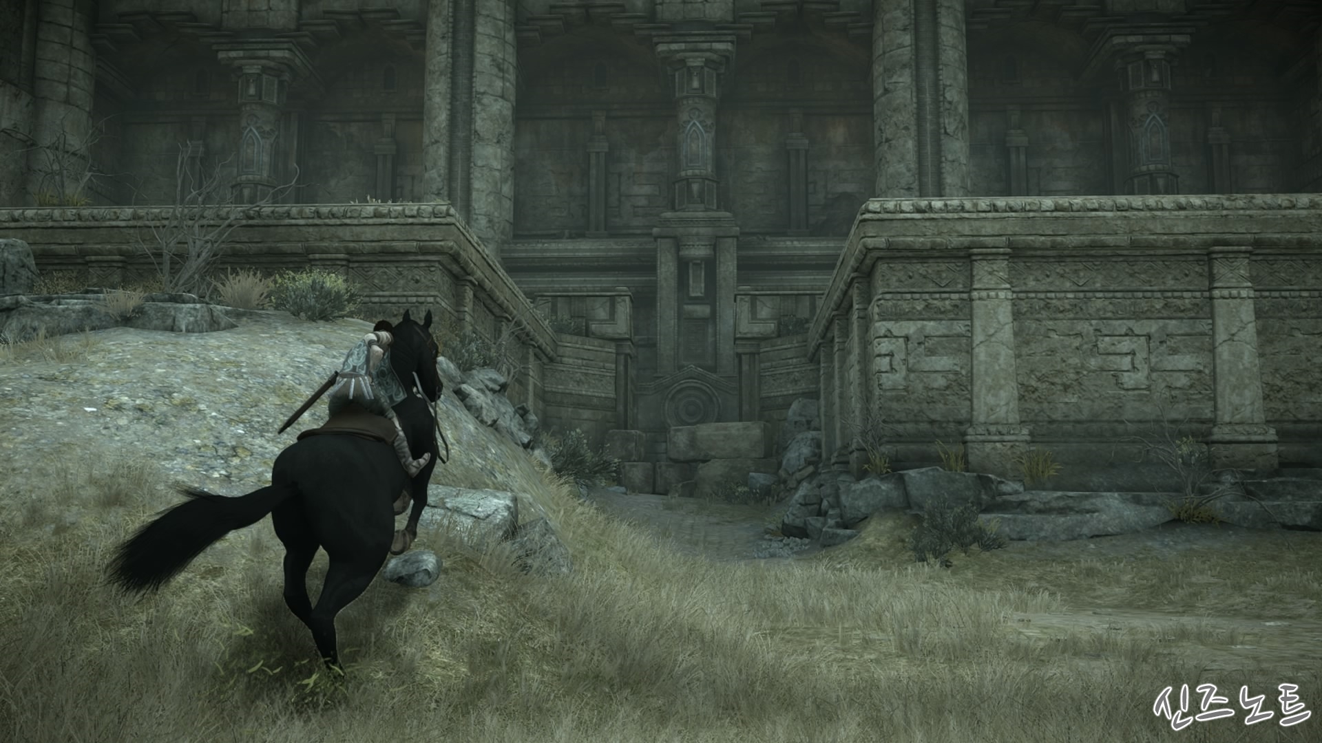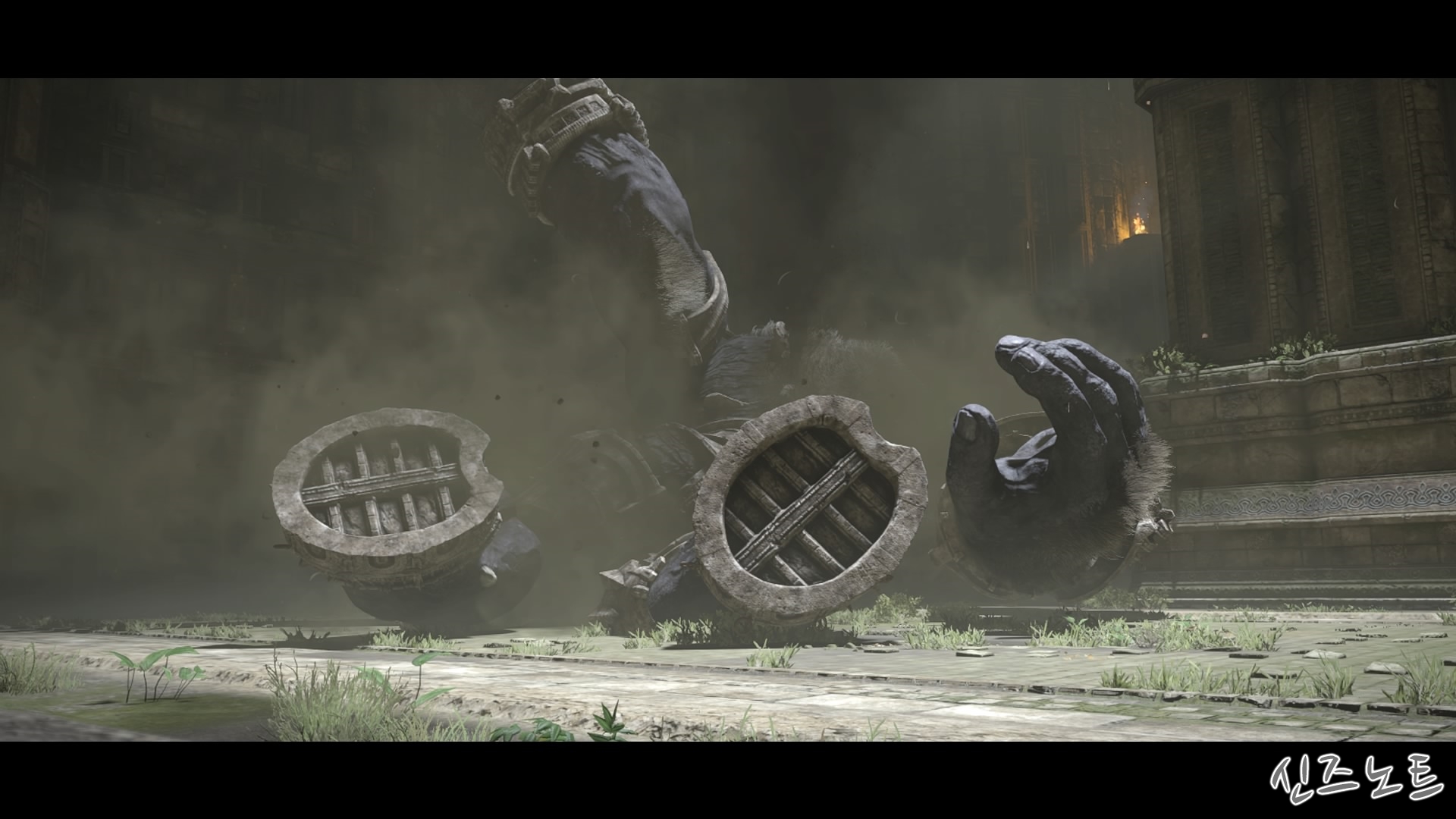 발판이 될만해 보이는 벽들을 모조리 부수면서 돌격해 오는데, 이 때부터 거상의 움직임이 빨라지기에 압박감이 밀려온다. 그대로는 맞설 수 없으니 입구의 반대편으로 가면 숨을 수 있는 공간이 있는데 일단 이 곳으로 숨자. 그러면 고개를 숙여서 안쪽을 보려고 하는데 이 때 수염에 매달려서 올라가면 된다. 네번째 거상과 비슷하다고 할 수 있겠다.