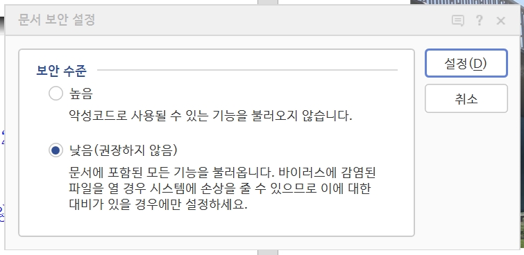 그리고 문서 보안은 낮음으로 해두는 것이 수백페이지 보고서를 아래아한글(한컴오피스)로 작성할 때 파일이 잘못되는 스트레스를 줄일 수 있다고 한다.