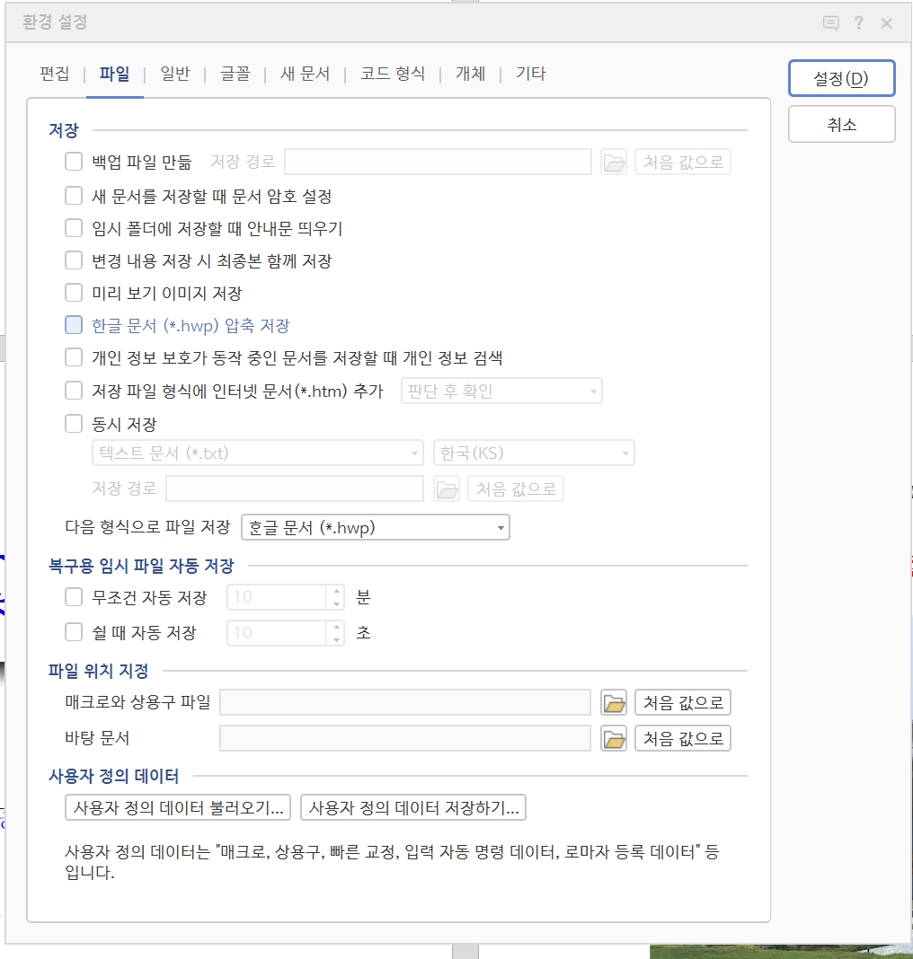 그리고 한컴2014에서 문서 안의 이미지들이 통으로 날라가버리는 치명적인 버그를 두번다시 겪고 싶지 않았기 때문에 아래와 같은 설정으로 최대한 한글2020이 뭔가 뻘짓(?)을 하다가 불안정해지는 가능성을 미연에 차단하고자 하였다. (아래 이미지 설정값 중에 백업파일 만듦은 현재 체크하고 사용하고 있다.)