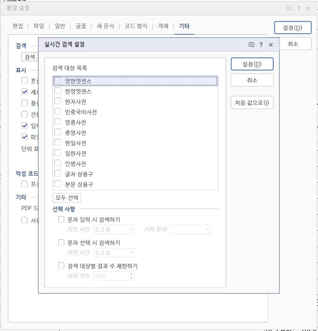 우선 실시간 사전 검색이 기본값이 되어버려서 상당히 불편했다. 실시간 사전검색을 끄려면 환경설정에서 기타 탭에 검색의 세팅을 아래와 같이 하면 된다.