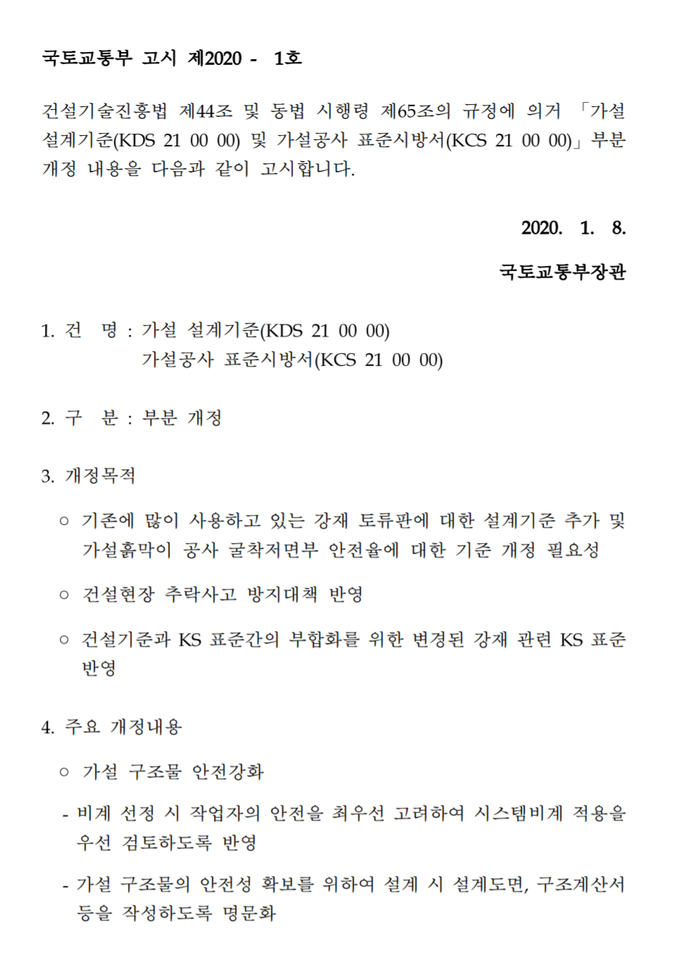 아래는 가설 흙막이 설계기준 개정 고시문이다. (2020.01.08)