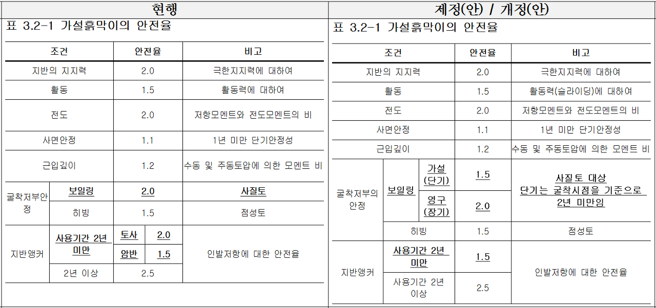 아래는 가설흙막이 설계기준 개정(2020.01.08) 신구조문대비표 이다.