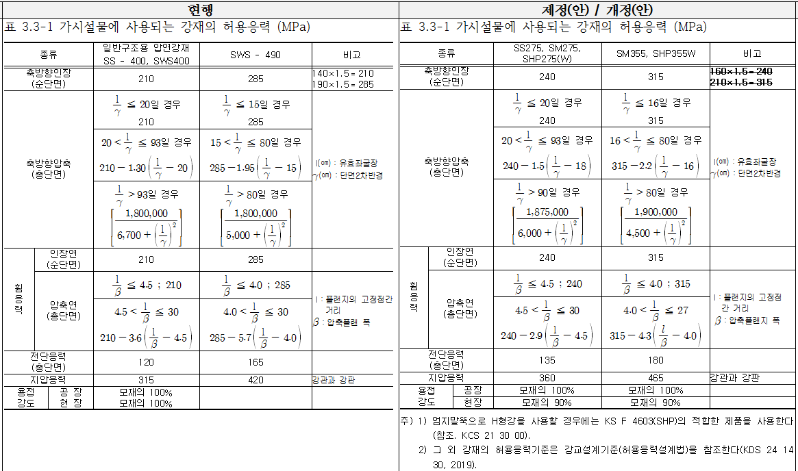 KS 표준 변경에 따른 강재 명칭 및 허용응력이 수정되었습니다. 참고로 허용응력은 강재 두께 16~40mm를 기준으로 산정하였으며, 도로교의 좌굴식을 적용하였습니다.