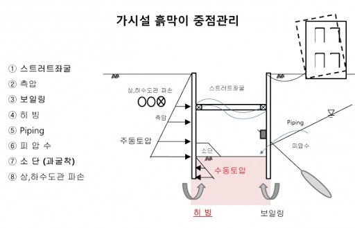“가설흙막이 벽체 후면 수위가 조사수위와 달리 상승될 수 있는 경우에는, 가설흙막이 설계 시 현장 여건을 감안하여 지하수위를 상승시켜 설계하여야 한다.” 와 “지반침하(함몰) 관련사항을 검토한다.”는 내용 추가됨.