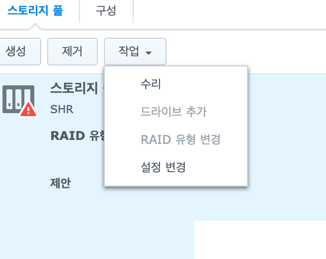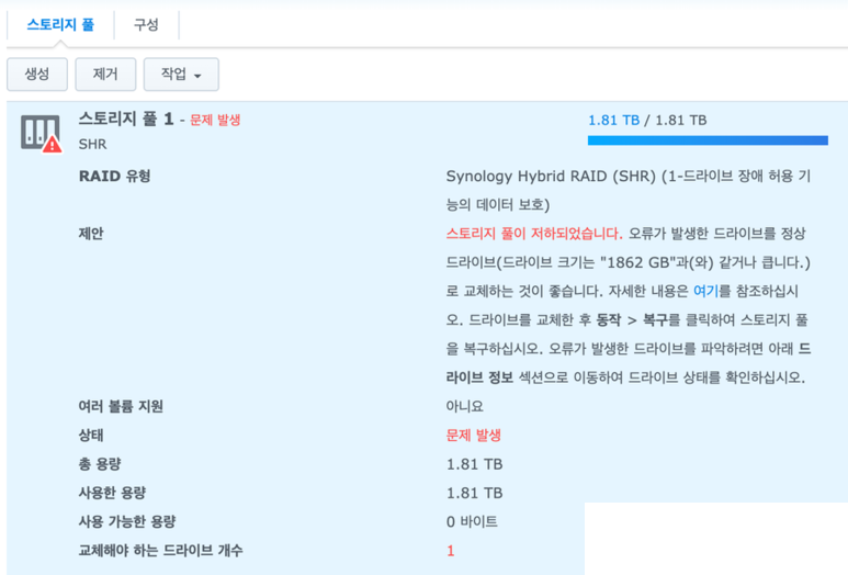 하나 이상의 스토리지 풀/SSD 캐시 성능이 저하됩니다. 오류가 있는 드라이브를 정상 드라이브로 교체할 것을 권장합니다. 스토리지 풀이 저하되었습니다.
