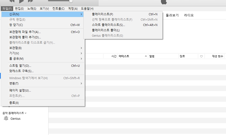 그 상태에서 아이튠즈 메뉴에 "파일->신규->플레이리스트"를 선택해서 새로운 플레이리스트를 만든다.