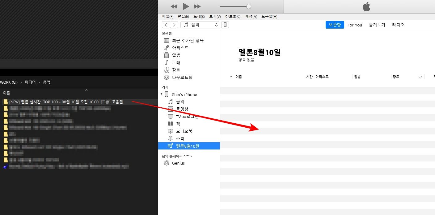 그리고 mp3파일들을 드래그해서 방금 만든 플레이리스트로 당겨오면 음악이 들어간다. (아래 그림 참고) 그림에는 폴더를 그대로 가져다 옮기는 것으로 표현했으나, 그 폴더 안으로 들어가서 mp3파일들을 선택한 다음 드래그앤드롭해도 된다. 폴더를 댕겨오든, 파일들을 댕겨오든 둘 다 가능하다.