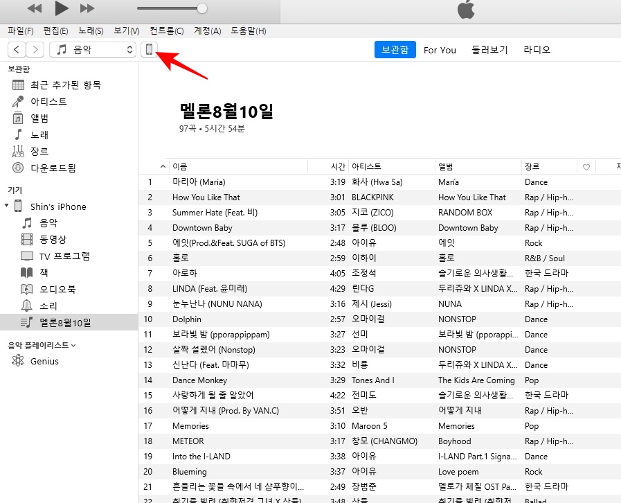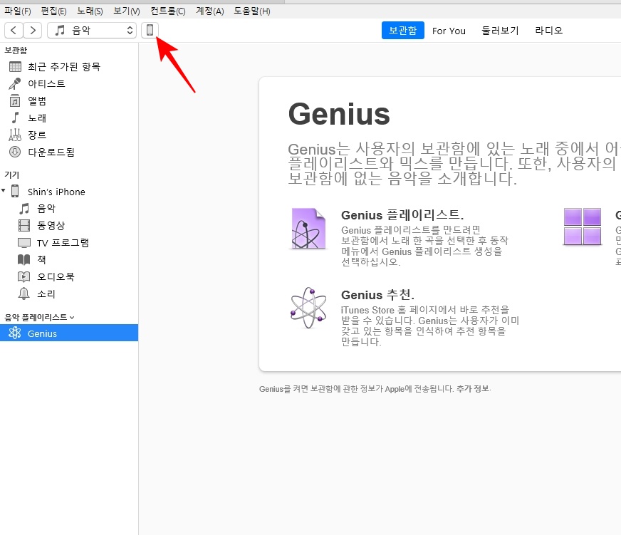 다 넣었으면 아이튠즈의 핸드폰 모양 버튼을 클릭한다. (아래 그림 참고)