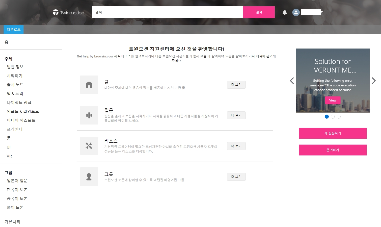 여기서 로그인을 하면 아래 그림과 같이 우측에 문의하기 버튼이 생긴다. 그 버튼을 누른다.