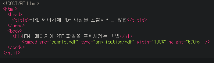 그리고 아래의 코드처럼 embed 태그로 간단하게 PDF 뷰어를 구현할 수 있다.