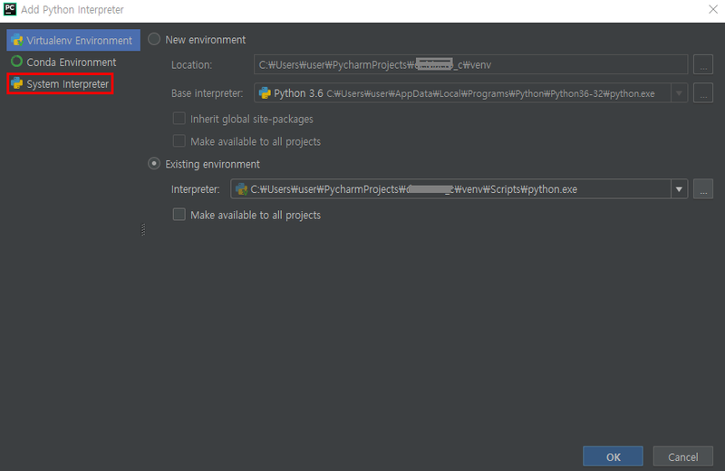 여러가지 패키지 작동 문제점이 발생할수 있으니 꼭 System interpreter로 해주시는것이 좋습니다.