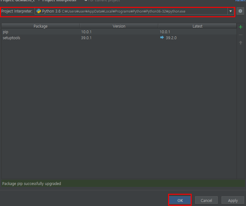 프로젝트 인터프리터를 위와같이 설정해주고 OK를 눌러줍니다.