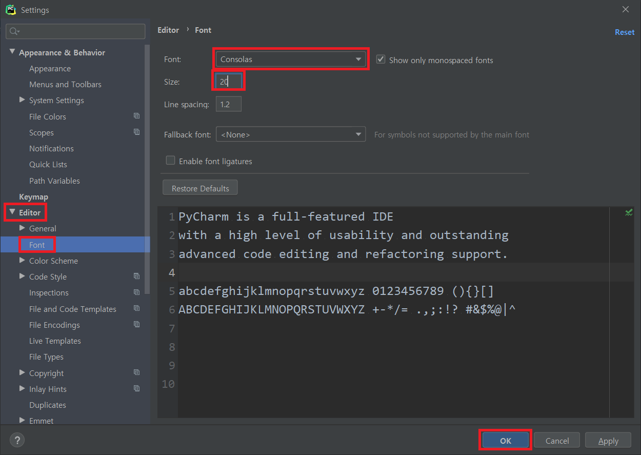 이 부분은 개인 취향에 따라 해도 되고 안 해도 된다. 개인적으로는 이렇게 폰트는 이런 설정으로 쓰는게 편해서 설정 해둔다. PyCharm 창에서 "Ctrl + Alt + s"(맥에서는 "cmd + ,")를 누르면 설정 창이 나오는데 거기서 Editor -> Font 로 들어갑니다. 거기서 Font는 Consolas, Size는 20으로 맞춰준다. 폰트는 Monospaced Font라고 해서 모든 문자의 너비가 같게 보이는 폰트의 종류인데, 이 폰트들을 사용하여야 대문자 I와 소문자 L, 숫자 0과 대문자 O와 같이 비슷하게 생긴 문자들을 헷갈리지 않고 코드를 작성할 수 있다.