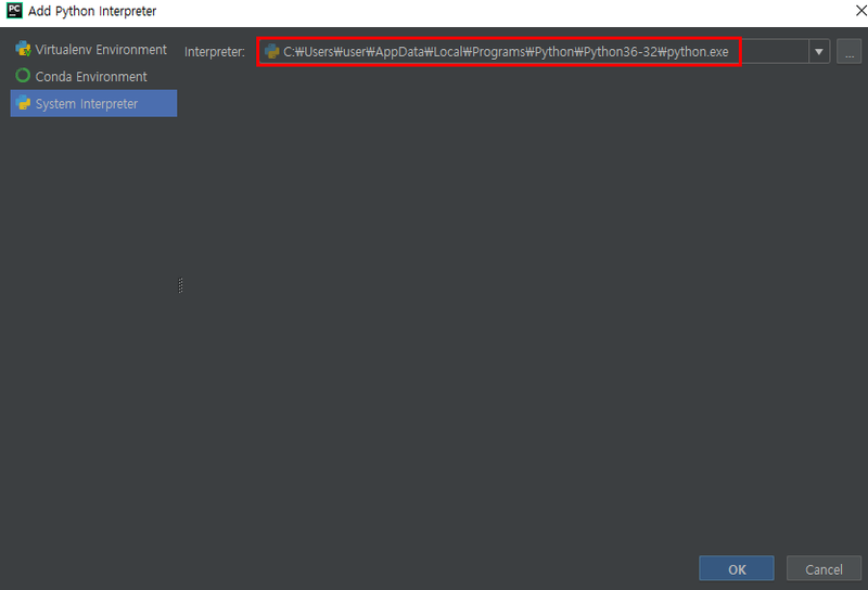 System interpreter에서는 내 컴퓨터에 설치되어 있는 파이썬의 기본 설치경로로 설정되어있다.
