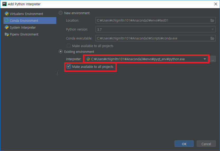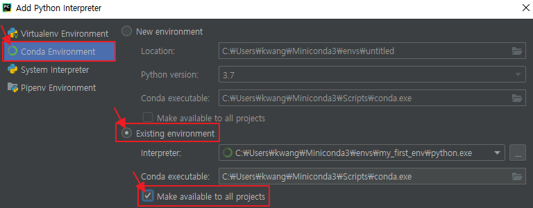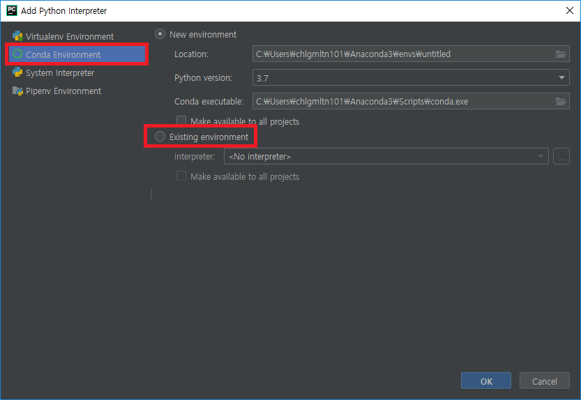 - Conda Environment 클릭 후 Existing environment을 체크한다.