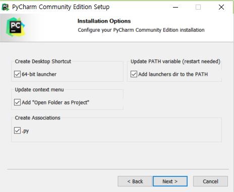 바로가기, 폴더에서 프로젝트 바로 열기, PATH에 등록하기 등을 모두 선택합니다. ( ※ 나중에 보니 컨텍스트 메뉴에 Add "Open Folder as Project" 체크는 하지 않는 게 더 번잡하지 않은 듯 하다. 최소한 PATH만큼은 체크해야 한다. -)