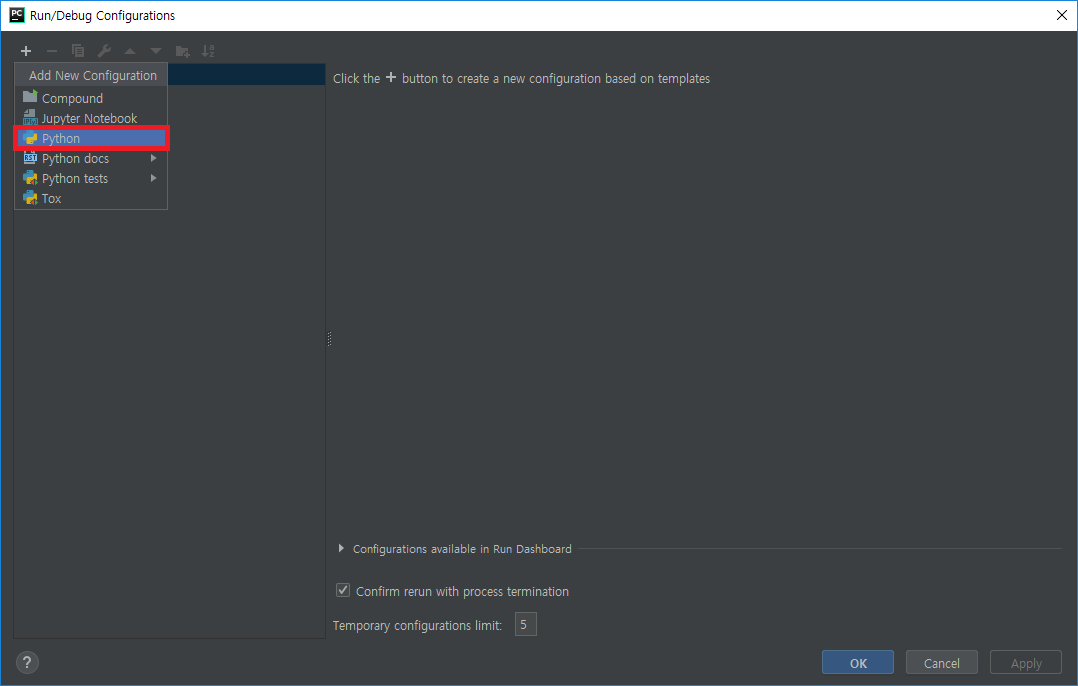 - 실행/디버그 구성(Run/Debug Configuration)이 없을 경우, Add Configuration 클릭