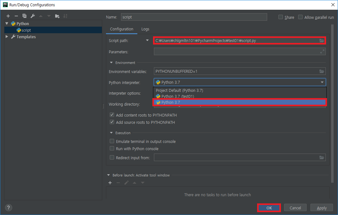- Script path가 내가 생성한 프로젝트 파일의 스크립트가 맞는지 확인