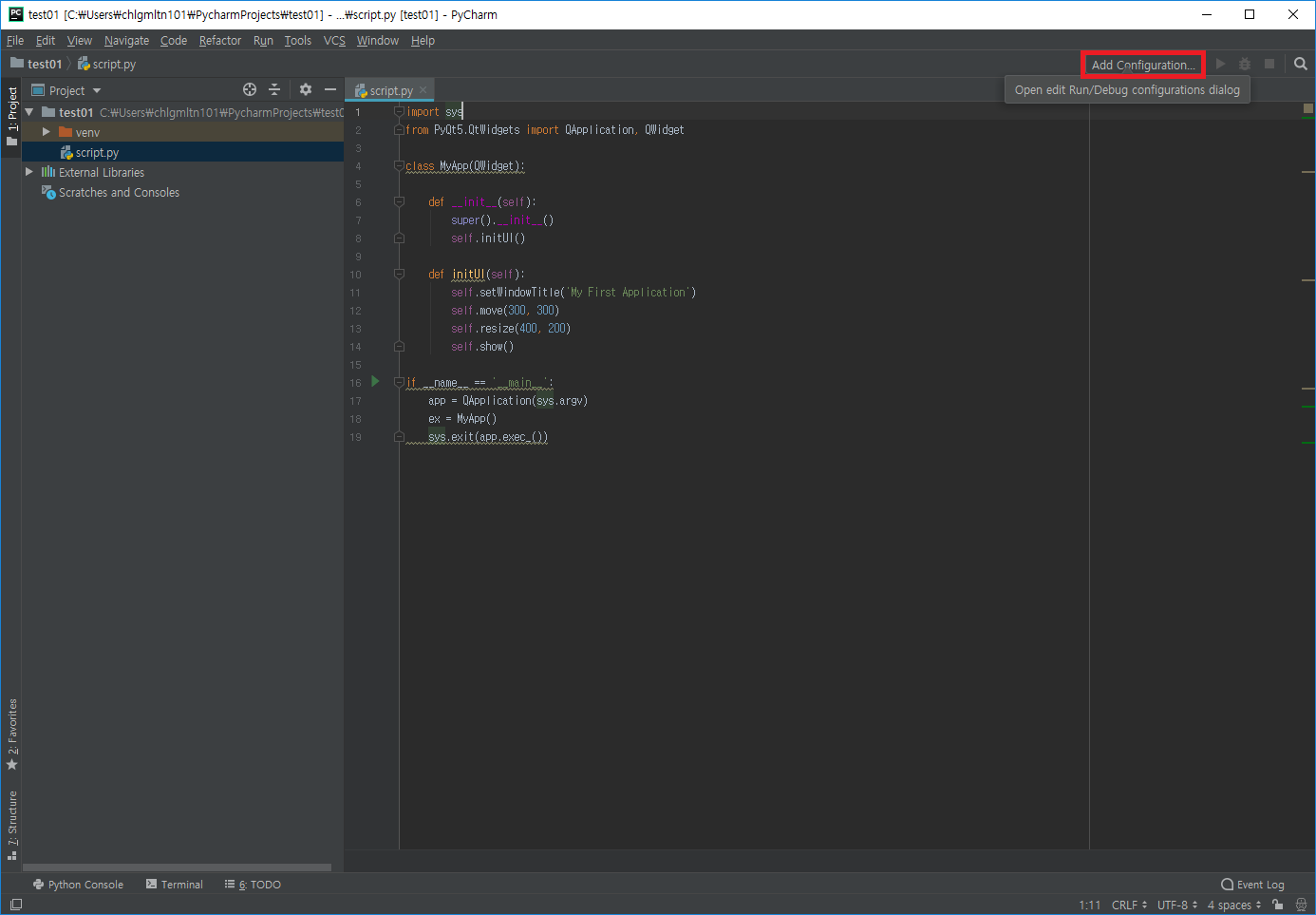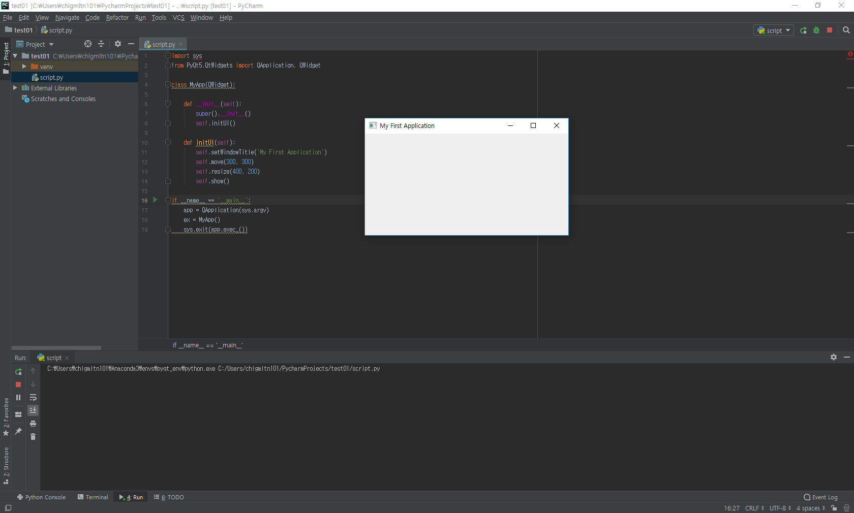 - 저번에 생성한 가상환경에 PyQt5 패키지를 설치했으므로 정상적으로 작동되는지 PyQt5를 이용해 창을 띄우는 코드를 실행시켜본다.