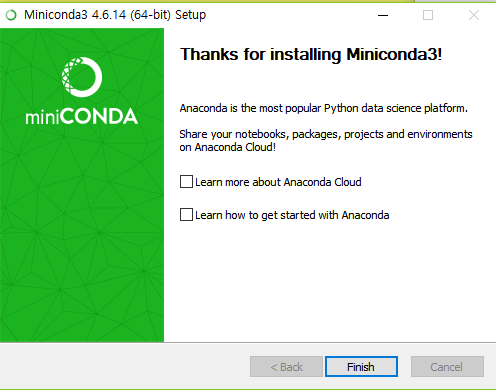 # 설치된 폴더로 이동합니다. $ cd C:\Users\kwang\Miniconda3\condabin # 아나콘다 버전을 확인합니다. $ conda -V conda 4.6.14 # 아나콘다 최신버전으로 업그레이드 합니다. # update: Updates conda packages to the latest compatible version. $ conda update conda # 가상환경을 만듭니다.(python 3.x버전이며 이름은 my_first_env입니다.) # create: Create a new conda environment from a list of specified packages. $ conda create -n my_first_env anaconda python=3