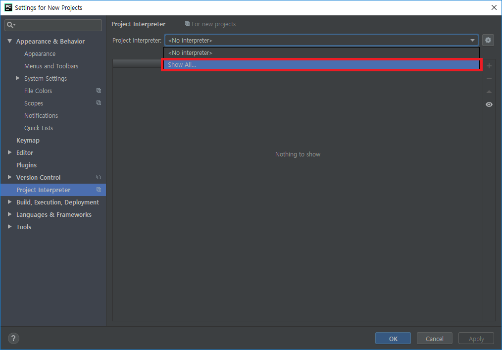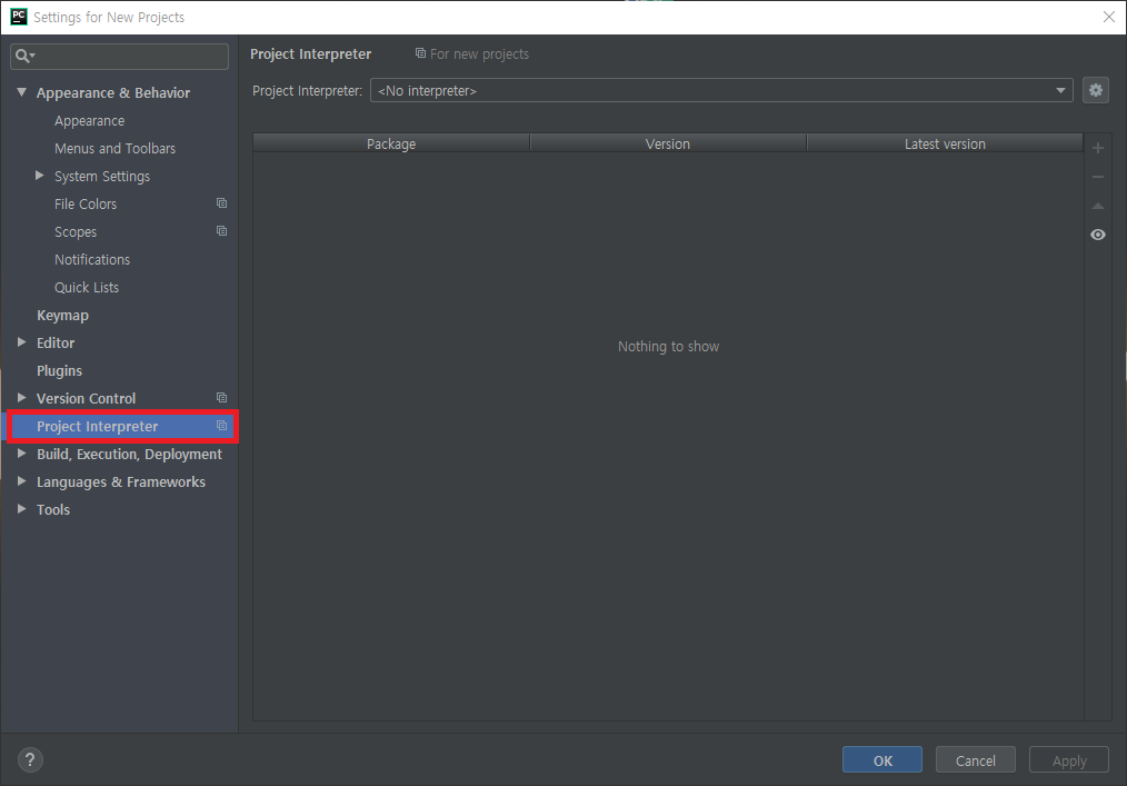 - Project Interpreter 클릭 후 Project Interpreter를 처음에 설정한 가상환경으로 변경해준다.