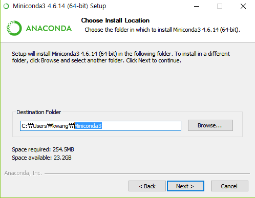 설치할 디렉토리를 입력합니다.실습은 현재 사용자 폴더 밑에 Miniconda3로 설치합니다.