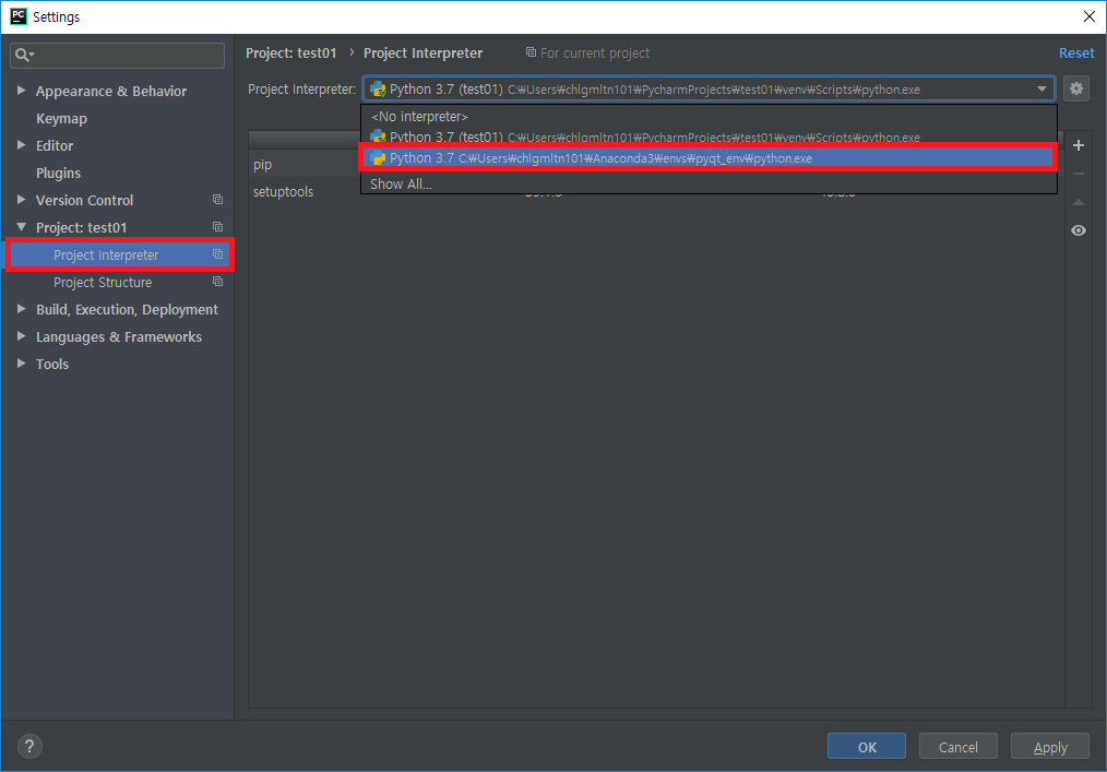 - Python Interpreter를 설정해준 Project Interpreter로 변경