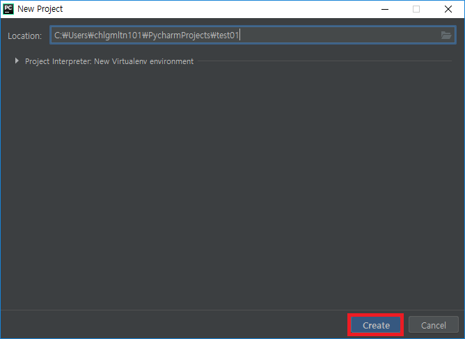 프로젝트 이름을 입력하고 인터프리터는 미리 등록해놓은 것을 선택합니다.(실습에서는 my_first_env를 선택)