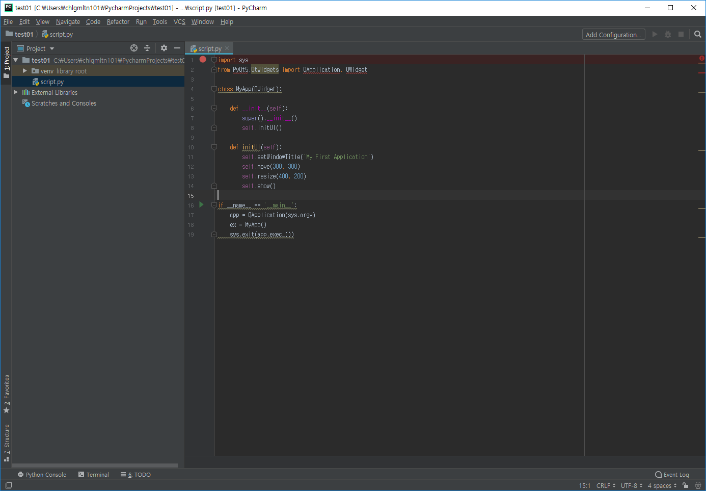 - 저번에 생성한 가상환경에 PyQt5 패키지를 설치했으므로 정상적으로 작동되는지 PyQt5를 이용해 창을 띄우는 코드를 실행시켜본다.