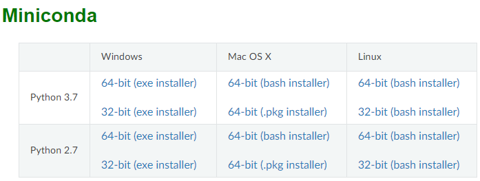 Conda latest Conda Conda-build Miniconda Help and support Contributing Conda license Docs » Miniconda Edit on GitHub Miniconda Windows Mac OS X Linux Python 3.7 64-bit (exe installer) 32-bit (exe installer) 64-bit (bash installer) 64-bit (.pkg installer) 64-bit (bash installer) 32-bit (bash installe...