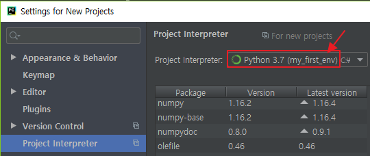 생성된 인터프리터를 선택합니다. (위에서 생성한 my_first_env이름을 확인할 수 있습니다)